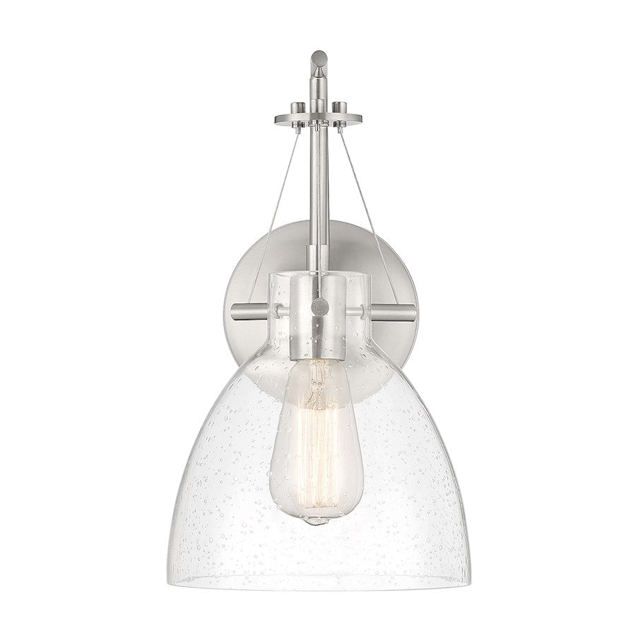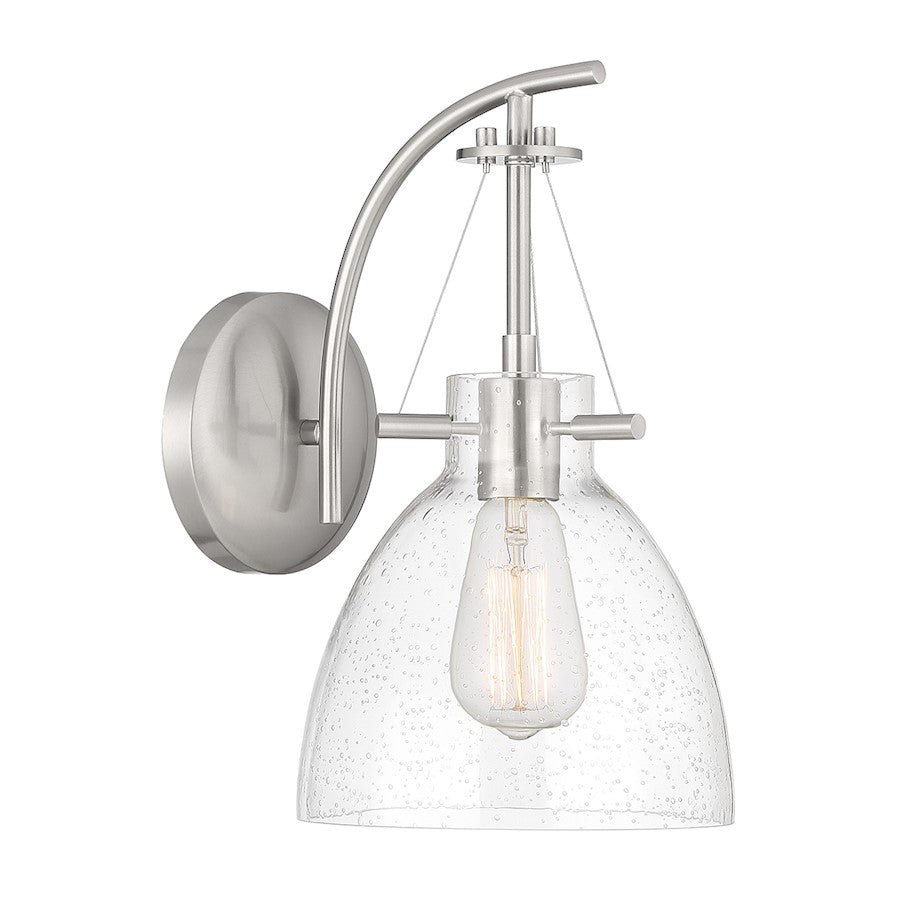 The Savoy House Foster 1-light sconce is the perfect way to add a sleek look to any space. Its large shade of clear seeded glass has a pleasantly curving shape and pairs nicely with the satin nickel finish. Foster is 14" in height, 8" in width and extends 10" from the wall. It uses 1 standard size bulb with a max of 60 watts (bulb not included).