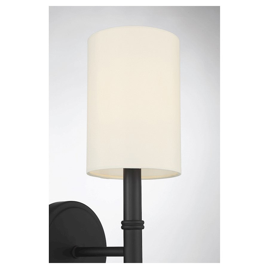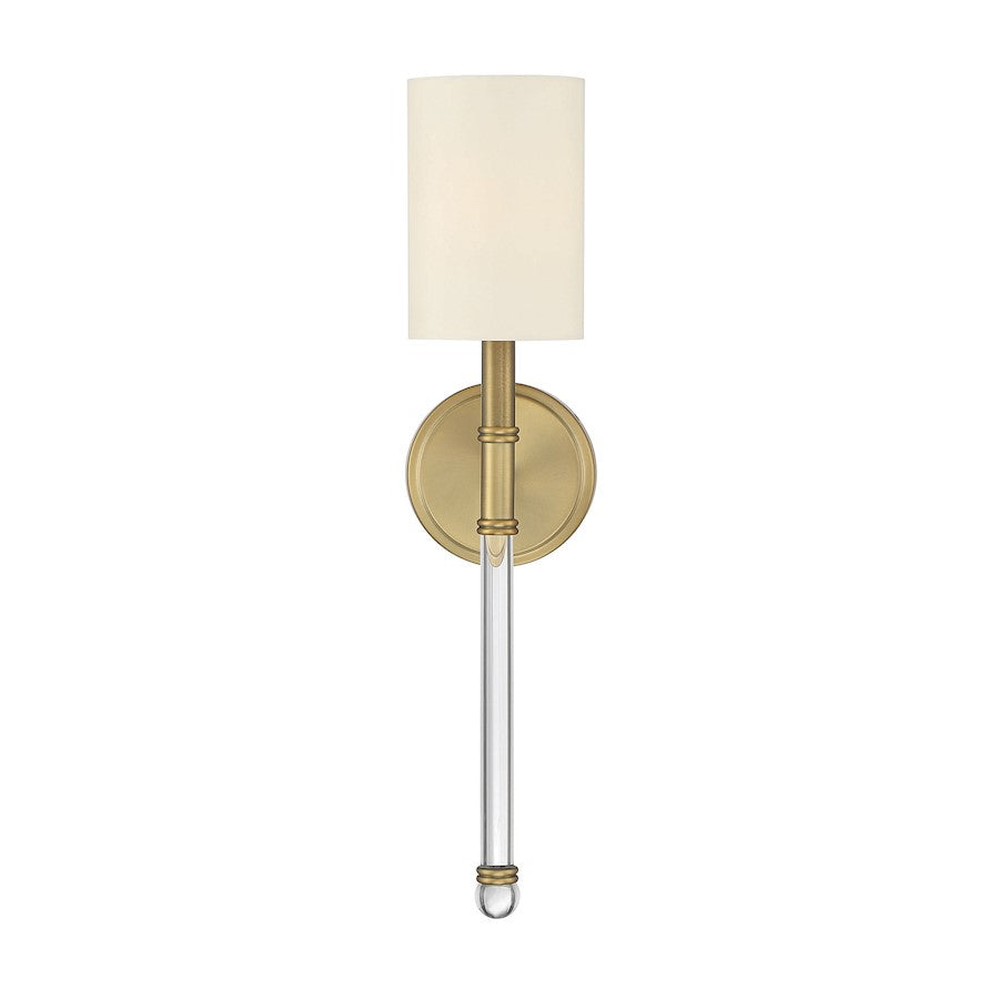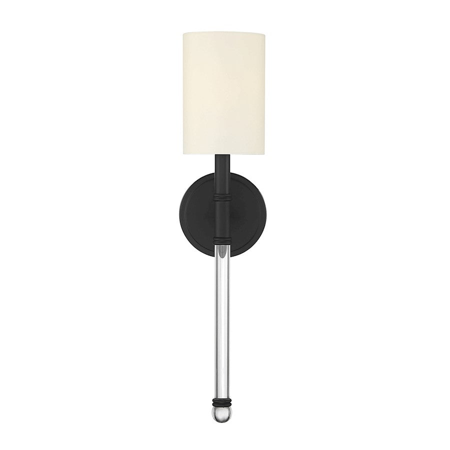 Slim and stylish! This Fremont sconce packs a whole lot of textural interest into one slender silhouette. The round wall plate and light arm have double ring detailing and a matte black or warm brass finish. The long tail of that arm is made of clear glass, with a double ring of polished nickel above the glass ball finial. And the cylindrical shade is a lovely, soft white fabric. Altogether, it’s an elegant fixture that is a pleasure to have in your home. One 60W, C-style bulb fits within the shade of this 5” wide and 21” high sconce. It’s the perfect size to place alone, in pairs, or several grouped together, along the walls of your dining room, kitchen, living room, entryway, bedroom, bathroom, office, family room, media room, or hallway.