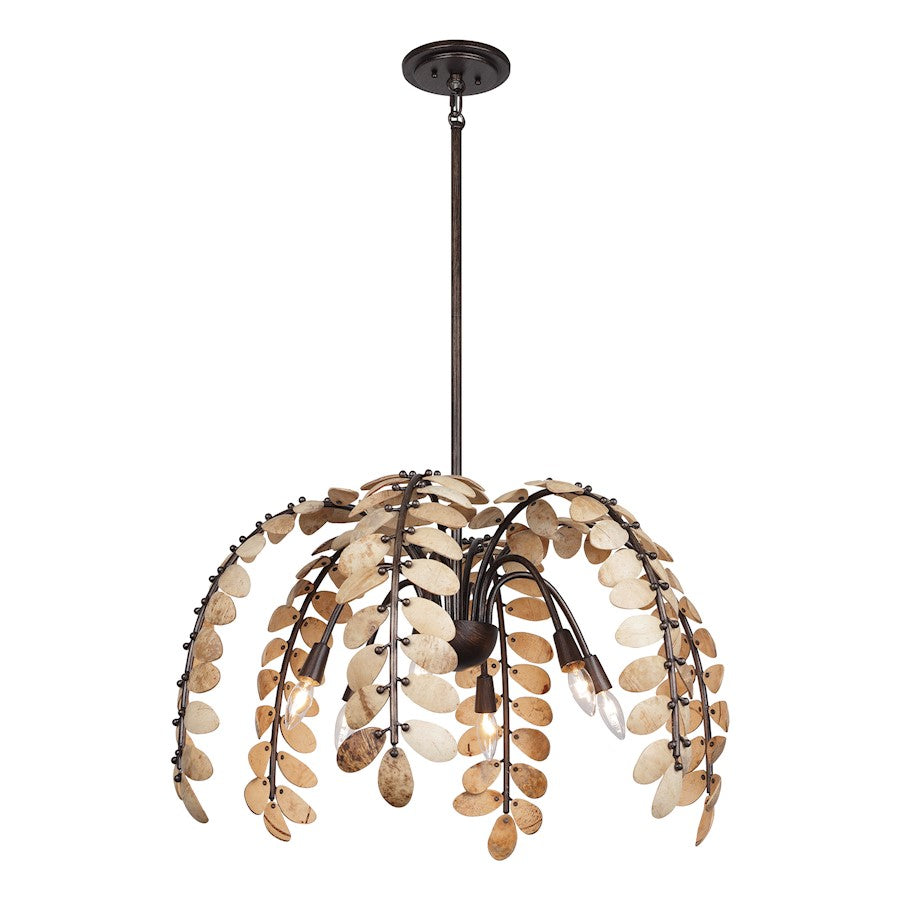 The Savoy House Grecian 6-light chandelier was designed by Breegan Jane, an award-winning interior designer and TV host. Boasting a charming cascade of branches decorated with leaves crafted from stained natural coco shell pieces, Grecian is a standout example of Breegan's signature nature-inspired designs influenced by her love of the Mediterranean. Each piece of coco shell is unique and may feature variations in patterning and color. A hand-applied Champagne Mist finish adds richness and texture. Grecian is 18" in height and 30" in width. Comes with four 12" downrods and one 6" downrod. Uses six candelabra size bulbs of up to 60 watts per bulb. Bulbs not included.