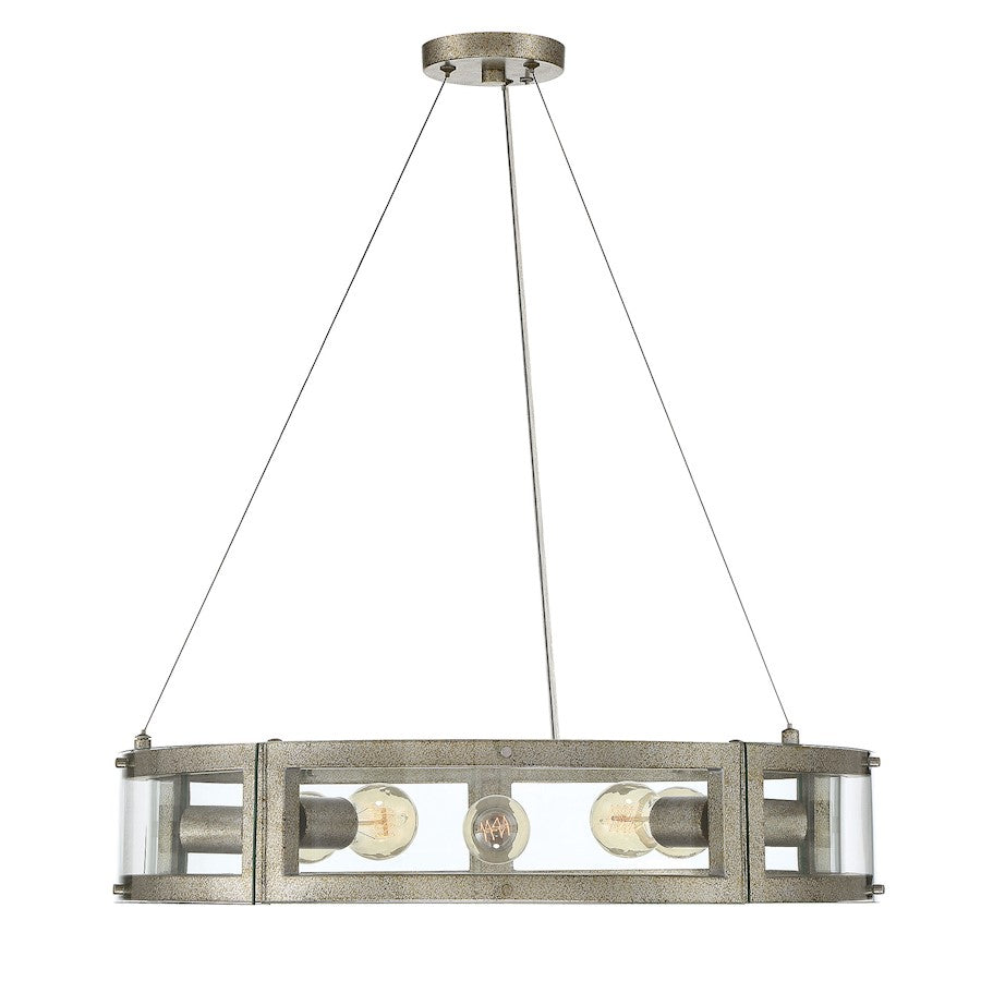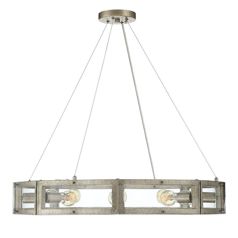 This slim and sleek Savoy House Harding 5-light or 8-light pendant has a unique look that will make a big statement! Long curving rectangular panes of clear glass are bordered by a structure finished in Gold Dust.