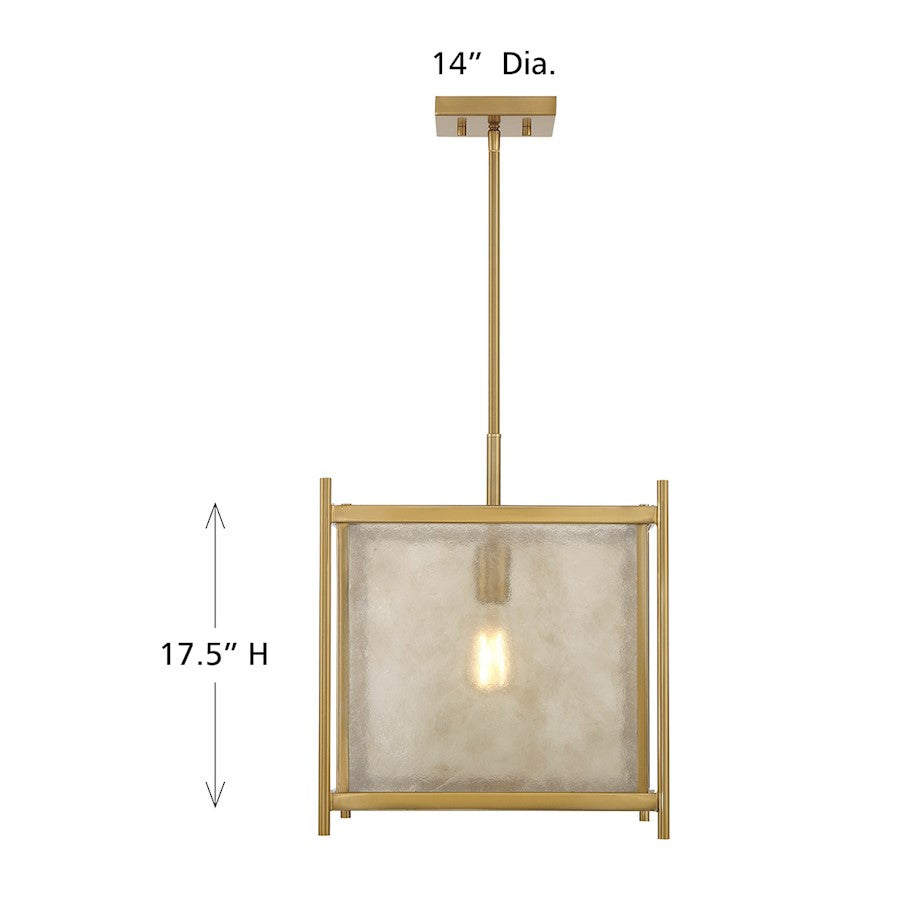 Create a warm and welcoming glow with the geometric chic Savoy House Jacobs 1-light pendant. The clear mica glass shade pairs beautifully with the Warm Brass finish and imparts eye-catching texture. Jacobs is 14" in width and has an adjustable height ranging from 17.5" to 71.5". Comes with four 12" downrods and one 6" downrod. Uses one standard size bulb of up to 60 watts. Bulb not included.