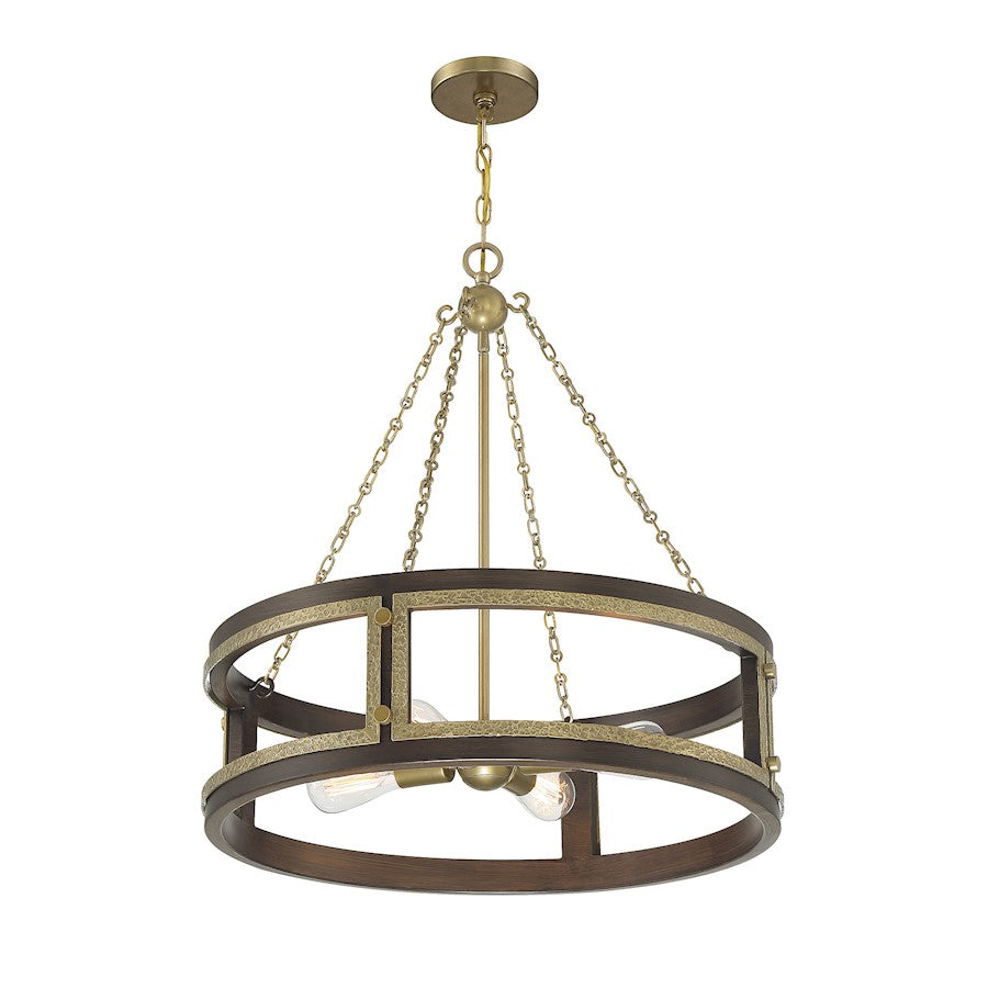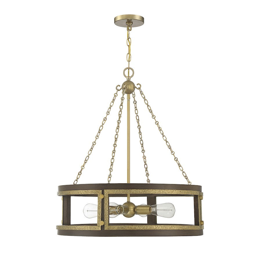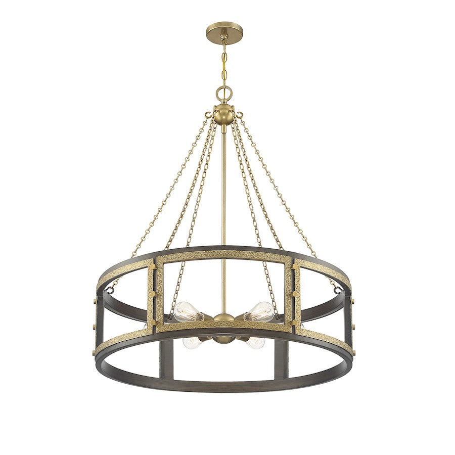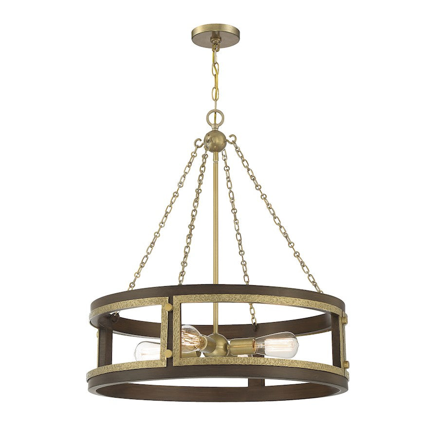 Handsome ruggedness meets elevated elegance with the Lakefield Collection. The timeless appeal of the dual Burnished Brass/Walnut finish with hammered detail and jewelry-inspired chain complement a variety of environments. Measuring 26" wide x 28½" high, the four-light pendant offers ample illumination from four 60-watt Edison-base bulbs or Measuring 34" wide x 40" high, the six-light pendant offers ample illumination from six 60-watt Edison-base bulbs.