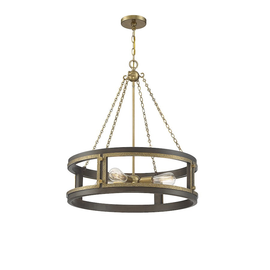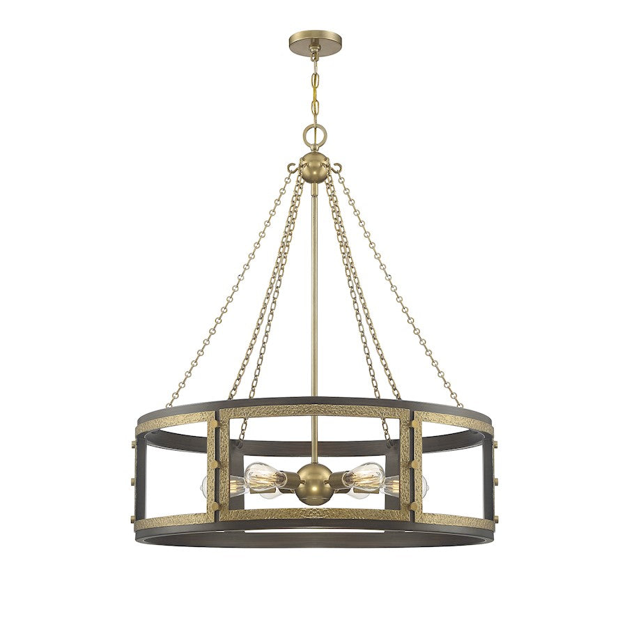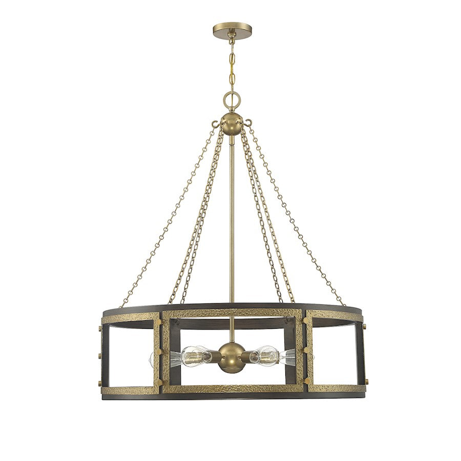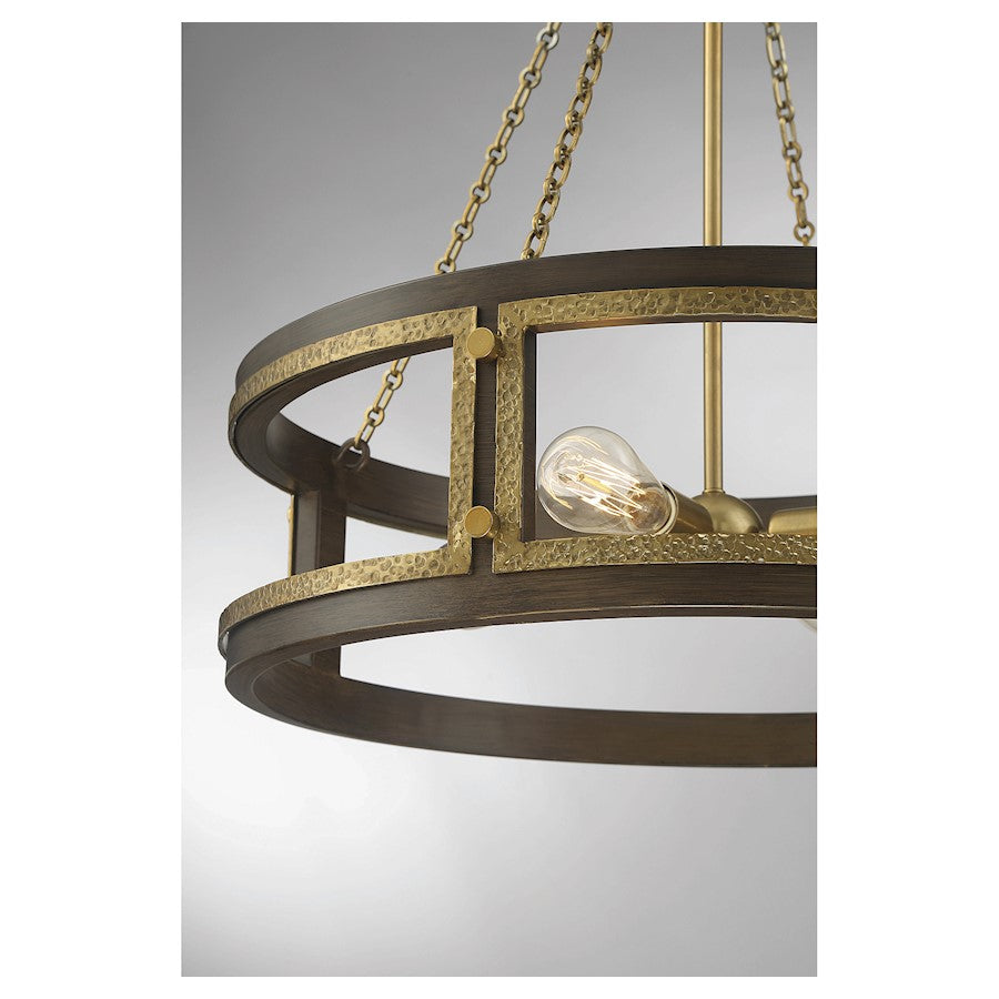 Handsome ruggedness meets elevated elegance with the Lakefield Collection. The timeless appeal of the dual Burnished Brass/Walnut finish with hammered detail and jewelry-inspired chain complement a variety of environments. Measuring 26" wide x 28½" high, the four-light pendant offers ample illumination from four 60-watt Edison-base bulbs or Measuring 34" wide x 40" high, the six-light pendant offers ample illumination from six 60-watt Edison-base bulbs.