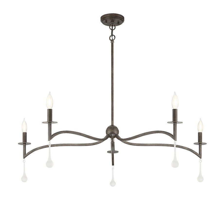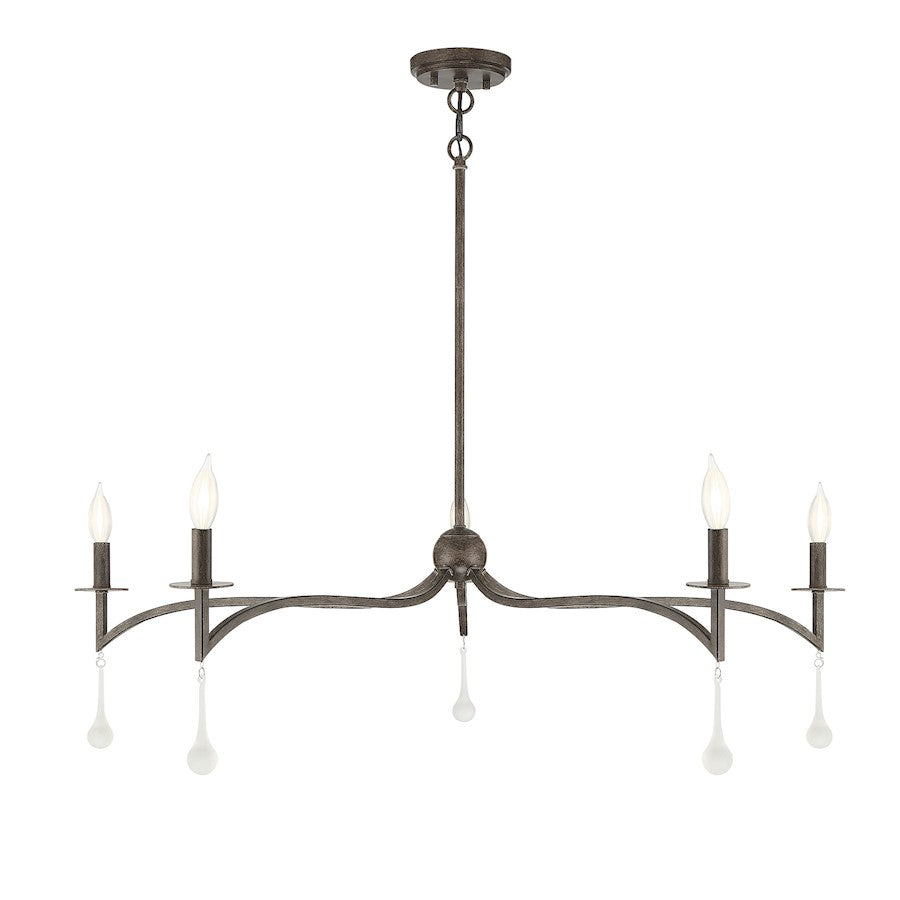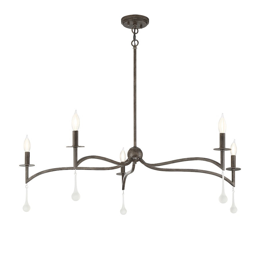 Slender arms allow the Savoy House Laramie 5-light chandelier to gracefully illuminate a lot of space without looking visually heavy or detracting from the surrounding decor. Elegant frosted crystal drops accentuate the Chelsea Walnut finish. Measuring 43" wide x 12" high, this five-light chandelier offers ample light from five 60-watt candelabra bulbs. Adding to the versatility is the adjustable hanging height from 18 to 64 inches.