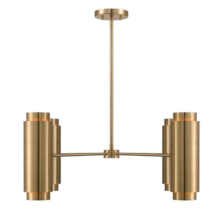 The Savoy House Lio 8-light chandelier is part of Moderne by Breegan Jane, bringing her signature approachable modern luxury style to your home. Breegan loves the timeless, elevating beauty of brass, as seen in this sleek and chic design. Bold solid metal cylinders finished in champagne-toned Noble Brass hold lights that shine out above and below to create a concentrated and dramatic lighting look. Lio is 31" in width and has an adjustable height ranging from 11.5" to 65.5". Comes with four 12" downrods and one 6" downrod. Uses eight candelabra size bulbs of up to 60 watts per bulb. Bulbs not included.