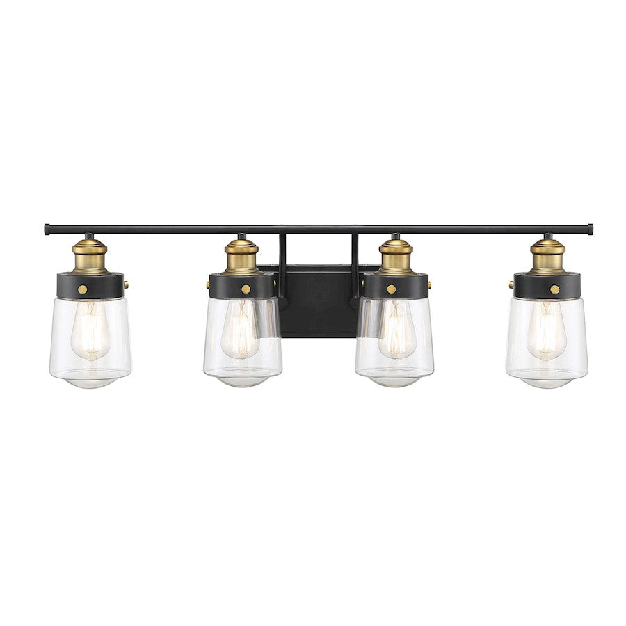 The ever-so-stylish, vintage-inspired look of the Macauley collection from Savoy House is now available as bath lights, including this 4-light bath bar. This fixture expertly combines schoolhouse-style molded glass shades, noticeable details like thumbscrews and the perfect pairing of black and brass to create a look that is sure to please. This fixture is 32" wide and 9.75" tall. It extends 6.75" from the wall. Uses 4 standard size bulbs of up to 60 watts each (not included).