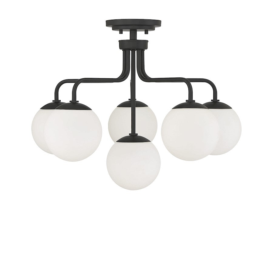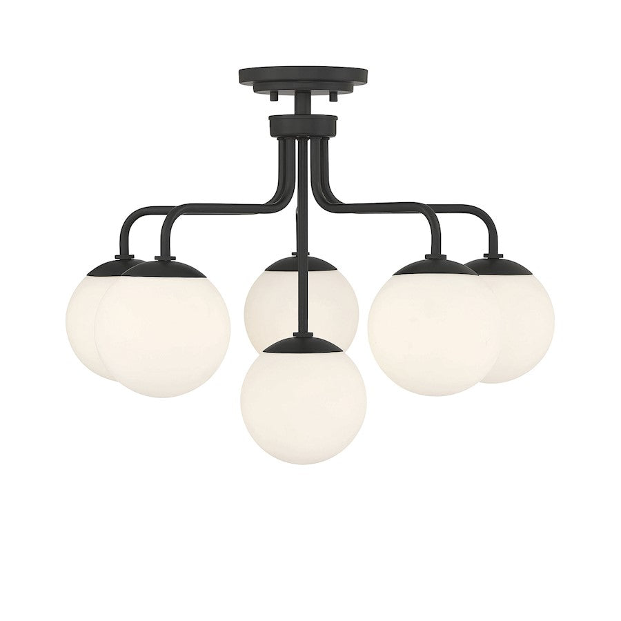The Savoy House Marco 6-light ceiling light delivers a sleek lighting look that is inspired by midcentury modern style. A minimal design finished in matte black keeps the focus on the light coming from shades of white opal glass. Marco is 18.25" in height and 24" in width. It uses six candelabra size bulbs of up to 60 watts per bulb.