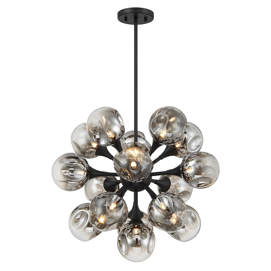 Heighten the drama of any room with the boldly beautiful Savoy House Matisse 16-light pendant. Its Sputnik style structure is studded with eye-catching dimpled shades of grey asymmetric plated glass and finished in Matte Black to create a spectacular look. Matisse is 22" in width and has an adjustable height ranging from 19.5" to 73.5". Uses sixteen G9 bulbs, which are not included. Comes with four 12" downrods and one 6" downrod.