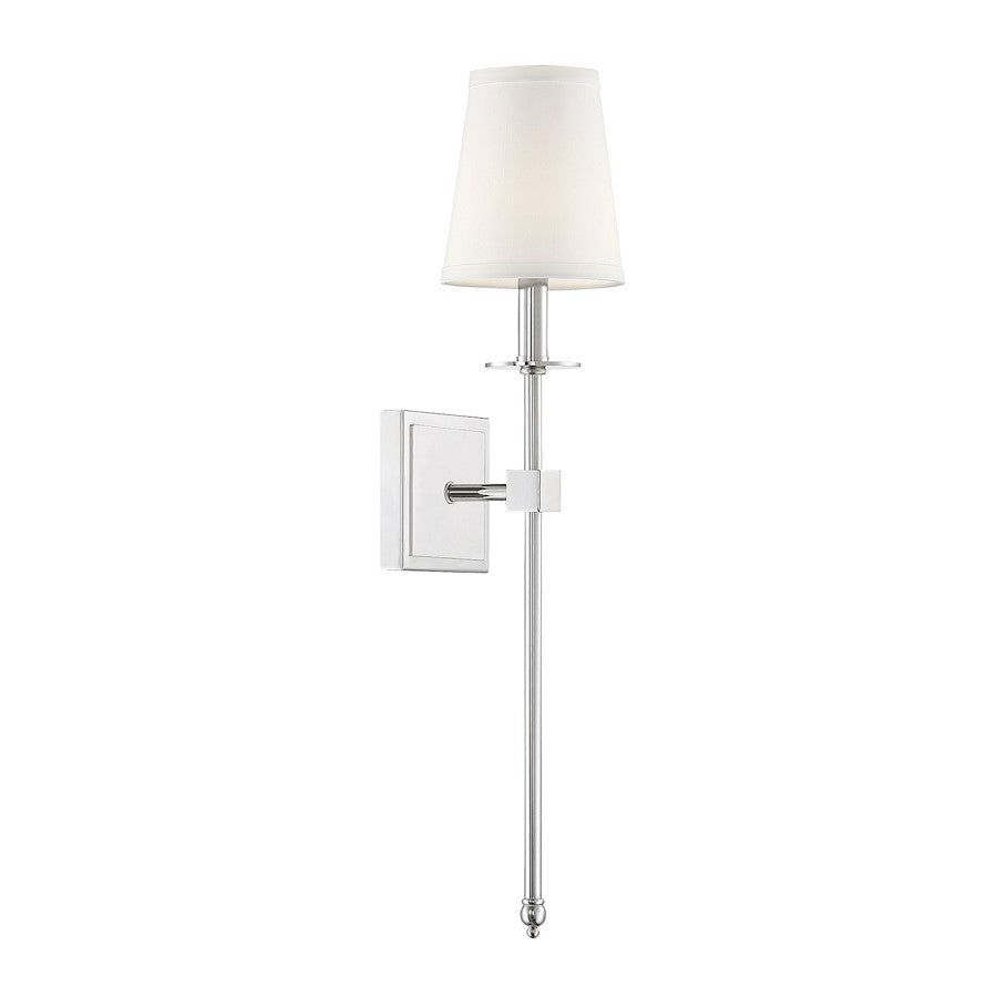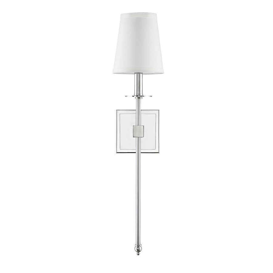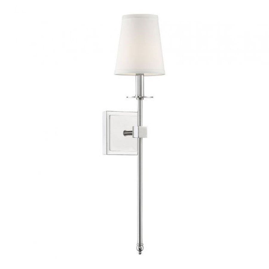 This Savoy House Monroe 1-light sconce features a long sleek body, a white fabric shade and a classy, contemporary silhouette. polished nickel finish. Sconces add a touch of style and light to any wall, including but certainly not limited to hallways, entryways, stairways, great rooms and dining rooms. You will also often see a pair of sconces flanking a bathroom vanity mirror to provide an even, flattering wash of light. Bulb not included. The polished nickel finish can be paired with nickel hardware or mixed with hardware in other finishes. Monroe is a perfect addition to rooms of any style, especially transitional or classic. When you choose a Savoy House lighting fixture, you can be certain you’ve selected a piece that will withstand the test of time.