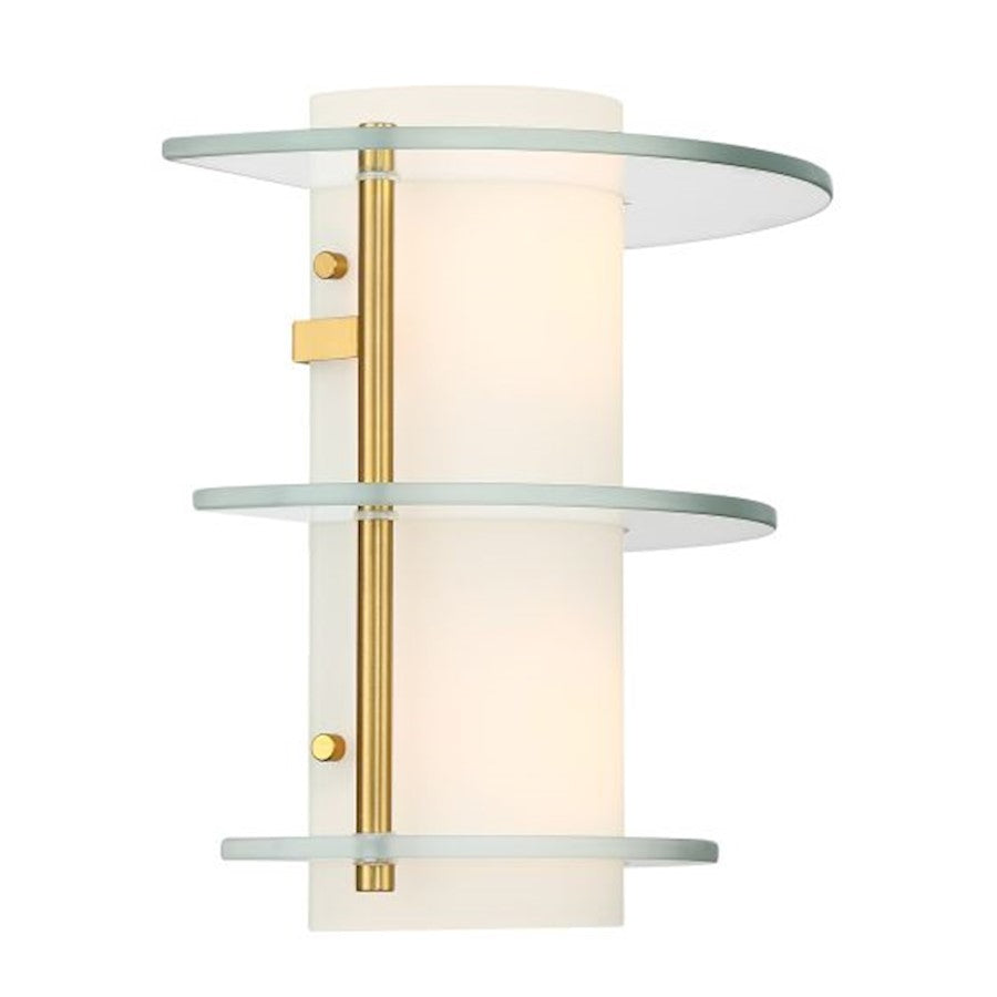 The Newell 2-light sconce from Savoy House is a standout example of Art Deco style. Three sleek discs of clear glass surround a core shade of opal glass to create a bright and intriguing glow. The Warm Brass finish is bright and chic. Newell is 12" in height, 10.25" in width and extends 6.25" from the wall. Uses two candelabra size bulbs of up to 60 watts per bulb. Bulbs not included. This sconce is damp area rated.