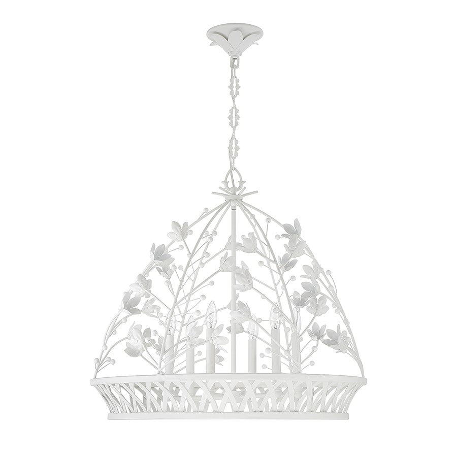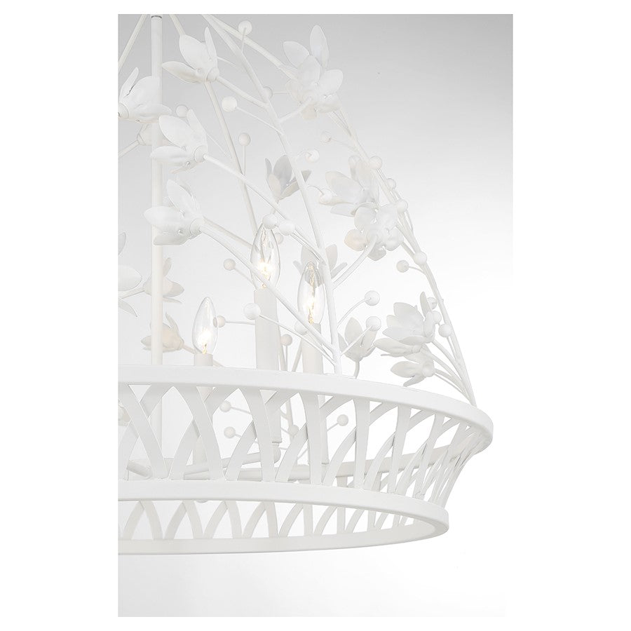 Add a little magic to any room with the whimsical Savoy House Oakmont 6-light pendant, which features a basket-like structure adorned with rows of lovely metal flowers finished in bisque white. It is 27” in height and 29” in width. It uses 6 candelabra size bulbs of up to 60 watts per bulb (bulbs not included).