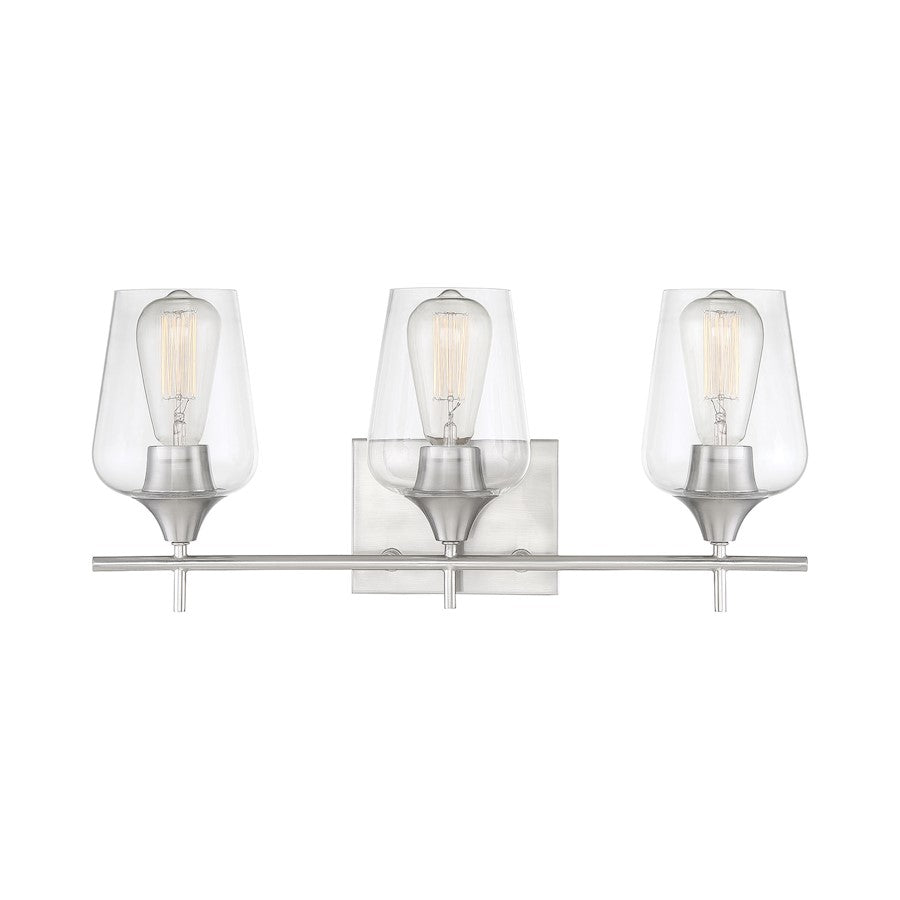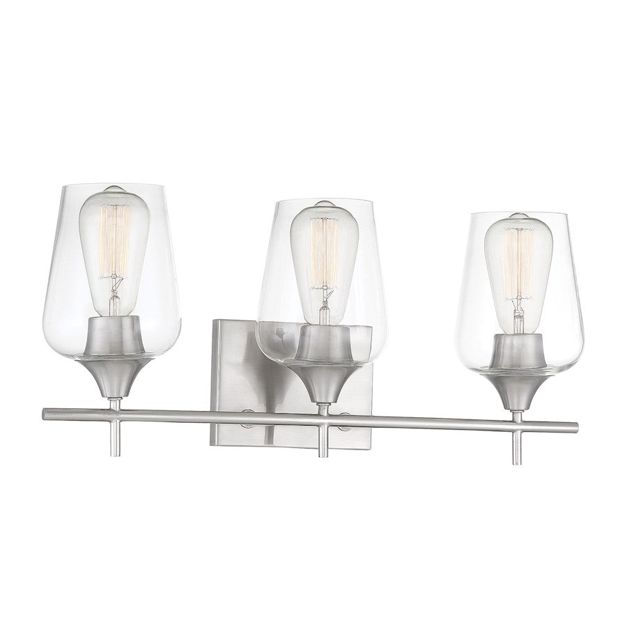 In the Savoy House Octave 3-light bath bar, bold light-colored lines and a streamlined silhouette create an air of elegance and sophistication. The satin nickel finish and clear glass shades go with absolutely everything. Whether you have transitional, contemporary, bohemian or other decor styles in your bath, you’ll love the way this Octave fixture stylishly blends in. The bath bar is 21" wide, 9.5" high and extends 5.5" from the wall. The curved glass shades have a graceful, uncluttered look and three 60W standard size bulbs provide lovely light above the vanity. Plus, it may be mounted as either uplight or downlight, creating a sleek and clean choice for your bathroom or powder room.