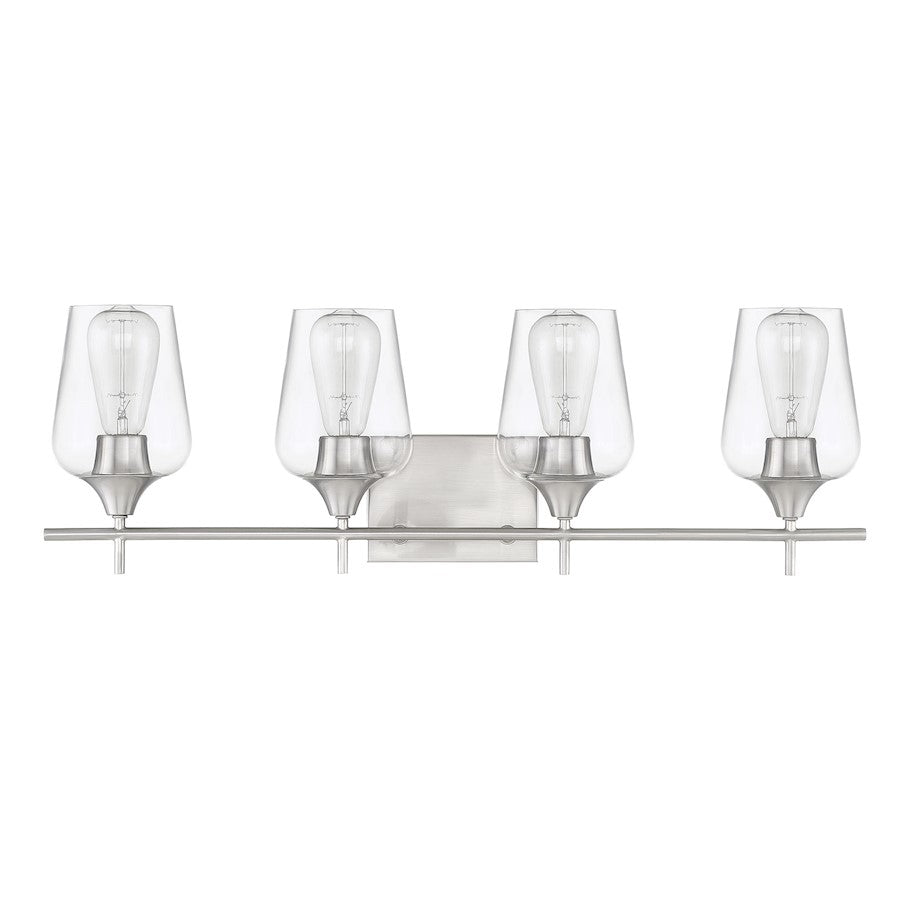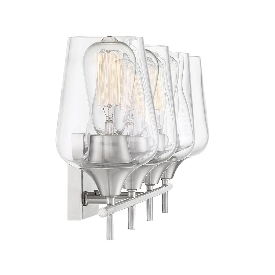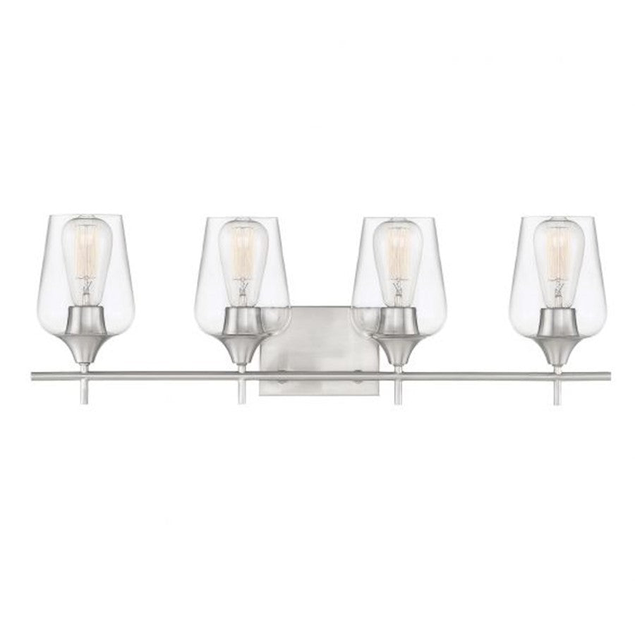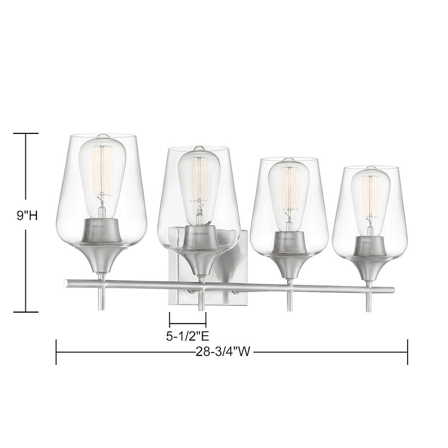 In the Savoy House Octave 4-light bath bar, bold light-colored lines and a streamlined silhouette create an air of elegance and sophistication. The satin nickel finish and clear glass shades go with absolutely everything. Whether you have transitional, contemporary, bohemian or other decor styles in your bath, you’ll love the way this Octave fixture stylishly blends in. The bath bar is 28.75" wide, 9.5" high and extends 5.5" from the wall. The curved glass shades have a graceful, uncluttered look and four 60W standard size bulbs provide lovely light above the vanity. Plus, it may be mounted as either uplight or downlight, creating a sleek and clean choice for your bathroom or powder room.
