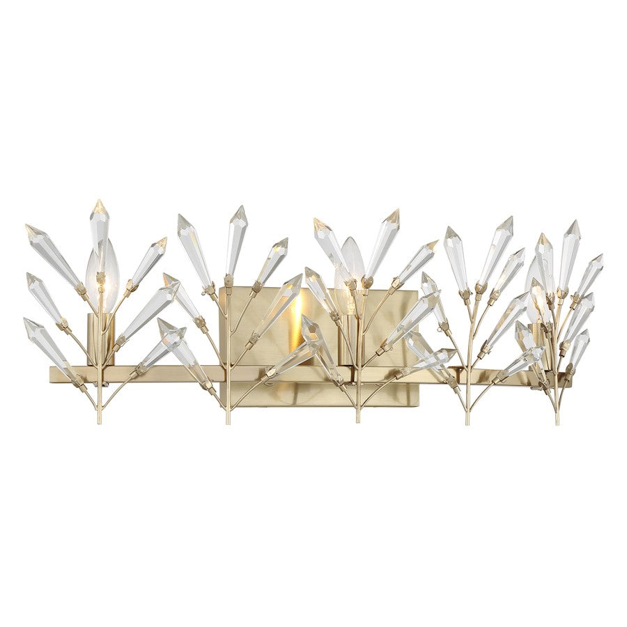 Decorate your home with the beautiful, nature-inspired Savoy House Orianna 3-light bath light. Its frame holds slim branches that are adorned with icicle-cut clear crystal accents. They glint and glimmer when illuminated and make a perfect match with the Noble Brass finish. Orianna is 8" in height, 24" in width and extends 6" from the wall. Uses three candelabra size bulbs of up to 60 watts per bulb. Bulbs not included. Mount as pictured. This bath bar is damp area rated.