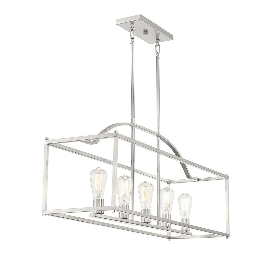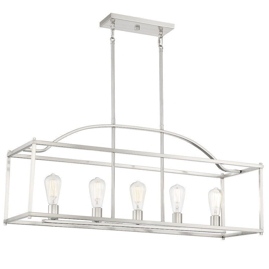 Generous in scale, the Palladian collection offers a streamlined aesthetic and an open cage that comfortably covers a wide area without looking heavy. With an adjustable height from 22" to 68" and measuring 38" long x 12" wide, this linear chandelier in a satin nickel finish provides ample illumination over a dining table or island from five 60-watt standard size bulbs.