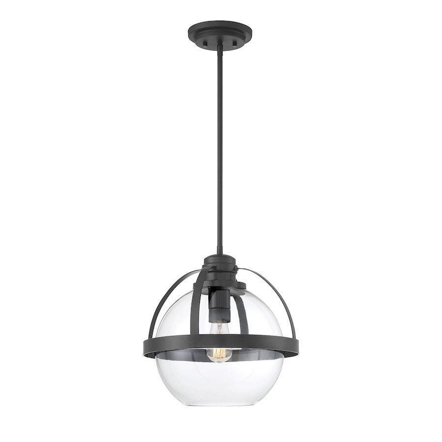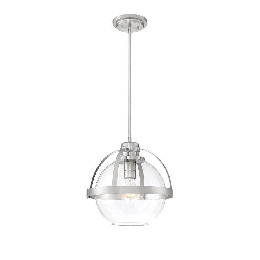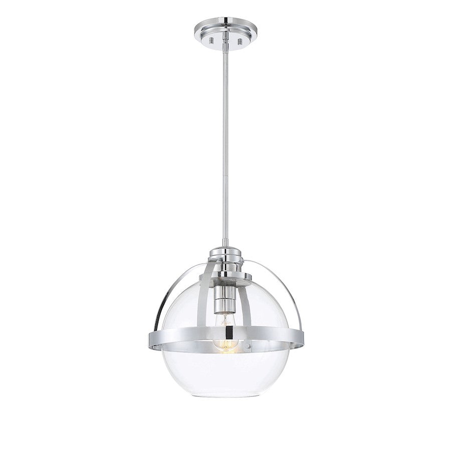 This Savoy House Pendleton 1-light pendant is a smart way to pep up the illumination and style in any room. It showcases a large orb of clear glass that is open at the bottom, allowing for more direct light and making it easy to replace the bulb. Metal bands bisect the shade and help hold it to the fixtureï¾’s base. Try using this fixture in kitchens, foyers, bedrooms and home offices, though truly the possibilities are endless. Finished in chrome, warm brass, matte black and satin nickel. This fixture is 14" wide and has an adjustable height that ranges from 14" to 45.5". Uses a standard size bulb of up to 60 watts (not included).