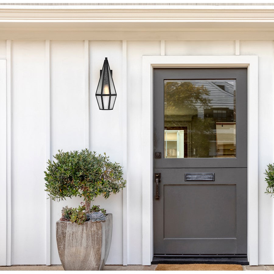 Decorate your great outdoors with the highly glamorous Savoy House Peninsula 1-light outdoor wall lantern. Its tall, slim, diamond-like design showcases panes of art glass that obscure the light within and create lots of eye-catching texture. Matte Black finish. Peninsula is 18" in height, 7.5" in width and extends 10.5" from the wall. Uses one standard size bulb of up to 60 watts. The bulb is not included. Wet area rated.
