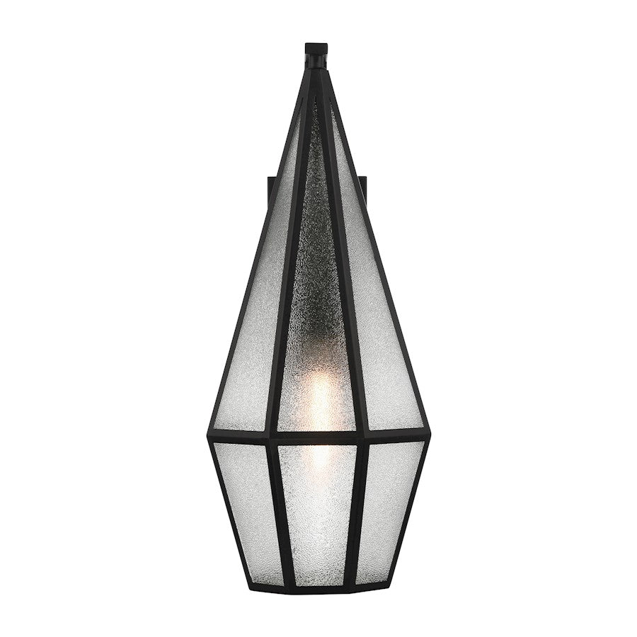 Decorate your great outdoors with the highly glamorous Savoy House Peninsula 1-light outdoor wall lantern. Its tall, slim, diamond-like design showcases panes of art glass that obscure the light within and create lots of eye-catching texture. Matte Black finish. Peninsula is 24" in height, 10" in width and extends 13.5" from the wall. Uses one standard size bulb of up to 60 watts. The bulb is not included. Wet area rated.