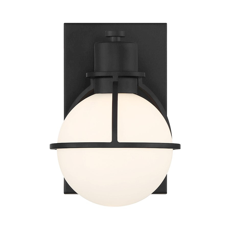 The Savoy House Pierce 1-light sconce offers up a retro, factory-inspired style that makes it an excellent choice for stylish bathroom lighting. A slender, curving half-cage finished in Black securely holds an orb of white opal glass that will provide a bright and welcoming glow. Pierce is 8.5" in height, 5.75" in width and extends 7" from the wall. Uses one G9 style bulb of up to 60 watts. Bulb not included. Install as shown. This sconce is damp area rated.