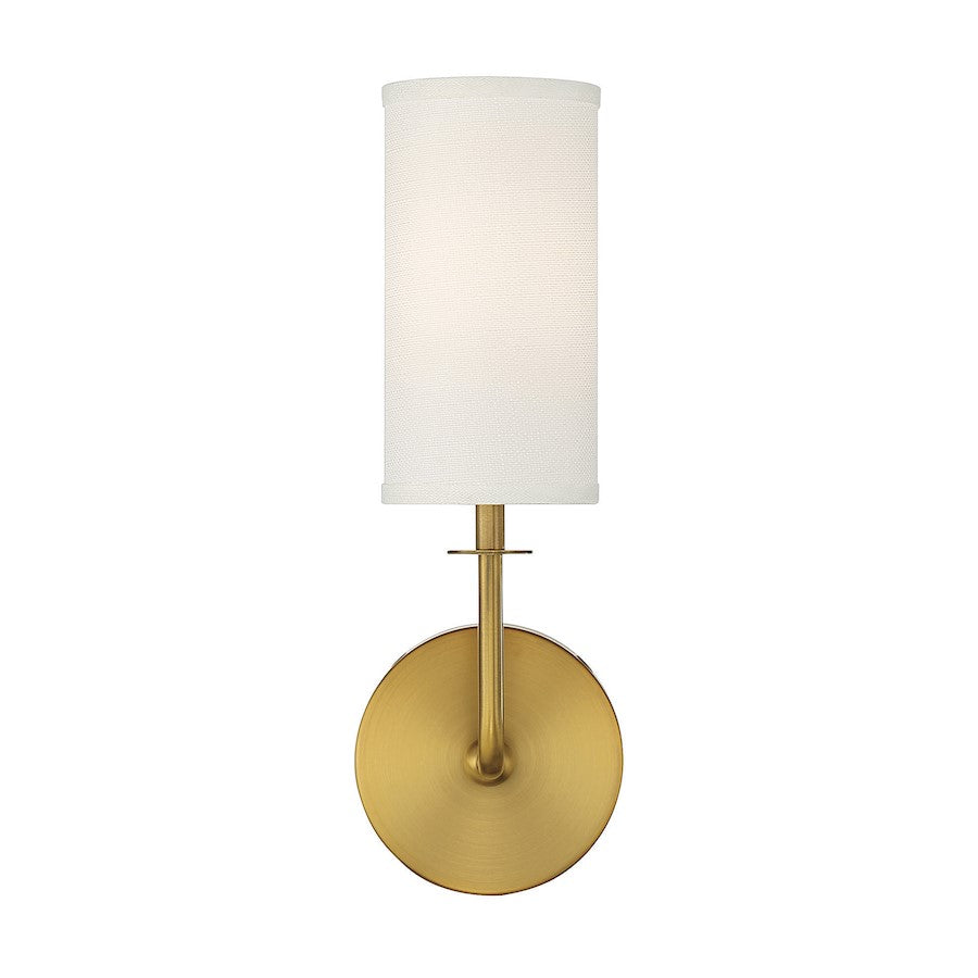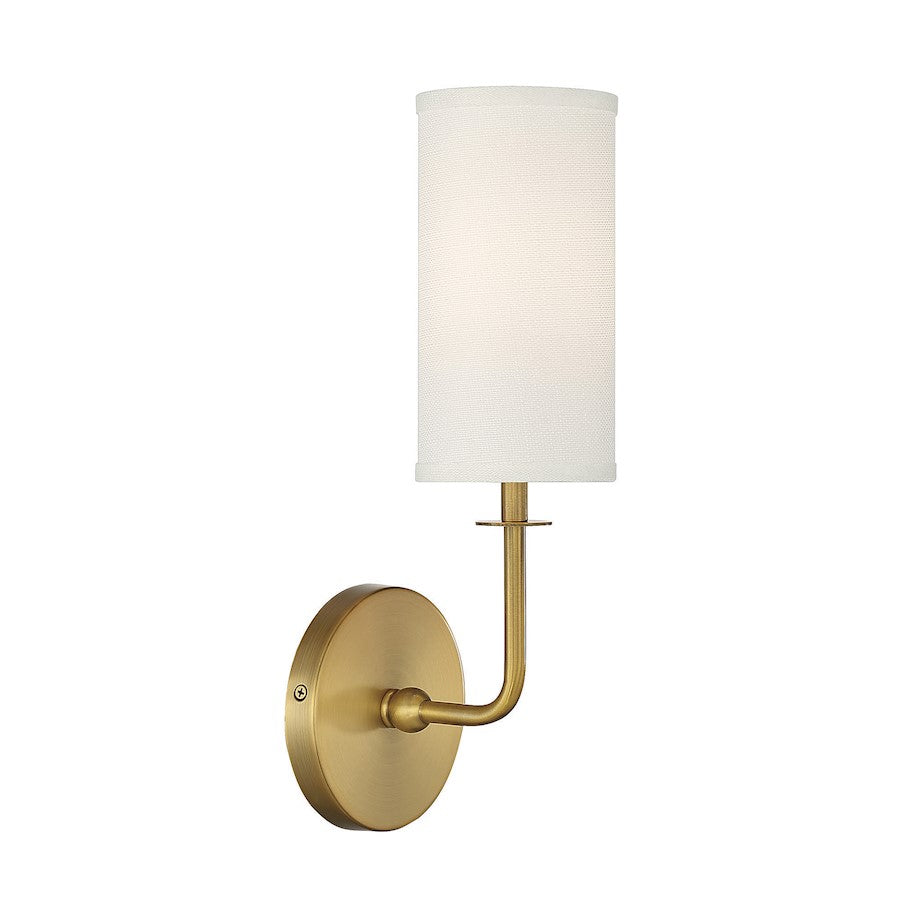 With the Savoy House Powell 1-light sconce, get simply chic lighting that will add a touch of brightness in any room. Use Powell solo or in groupings to meet any accent lighting need throughout the house! The tall cylindrical shade of white fabric pairs nicely with the effortlessly curving arm and warm brass finish. Powell is 15" in height, 5" in width and extends 5.5" from the wall. It uses one candelabra size bulb of up to 60 watts. Damp area rated.
