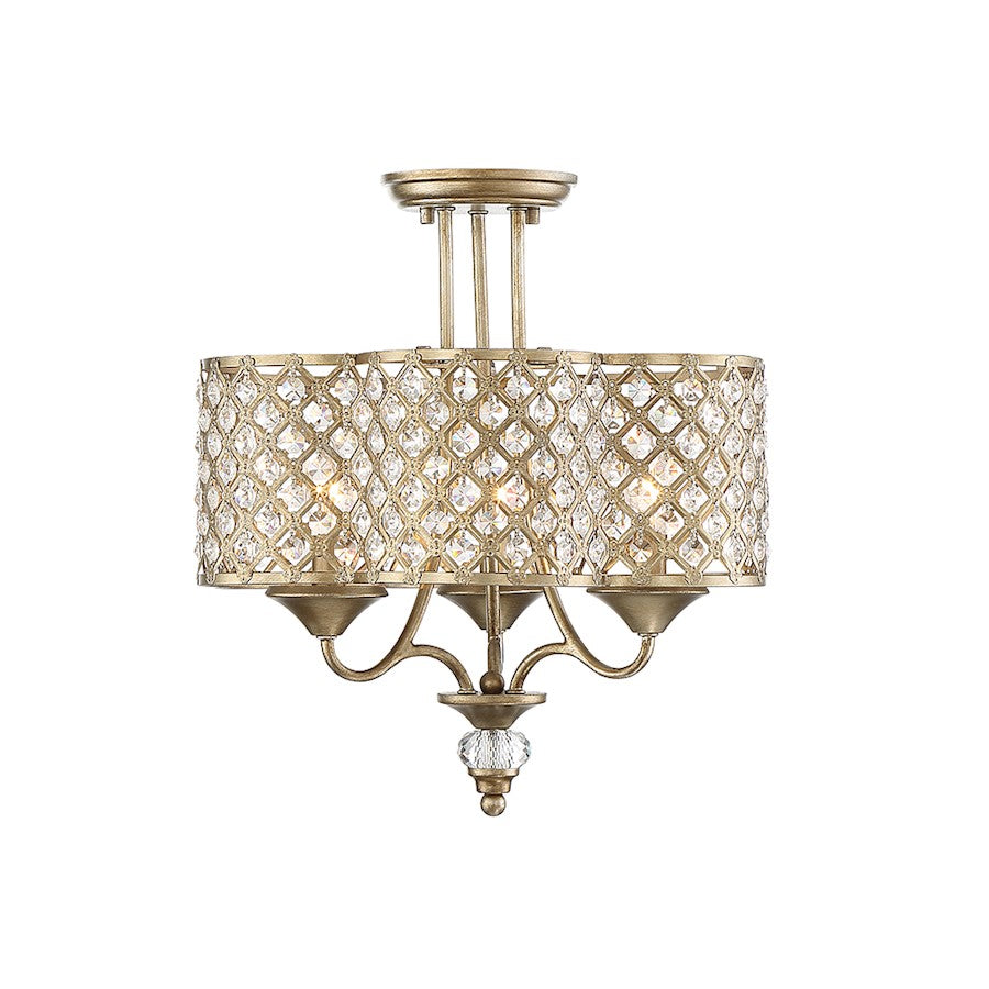 The Savoy House Regis 3-light ceiling semi-flush mount is a truly glamorous look that is perfect for those who want shimmer and shine. It has a drum shade featuring a latticework of clear crystals and an extra faceted crystal touch at the finial. Pyrite finish.