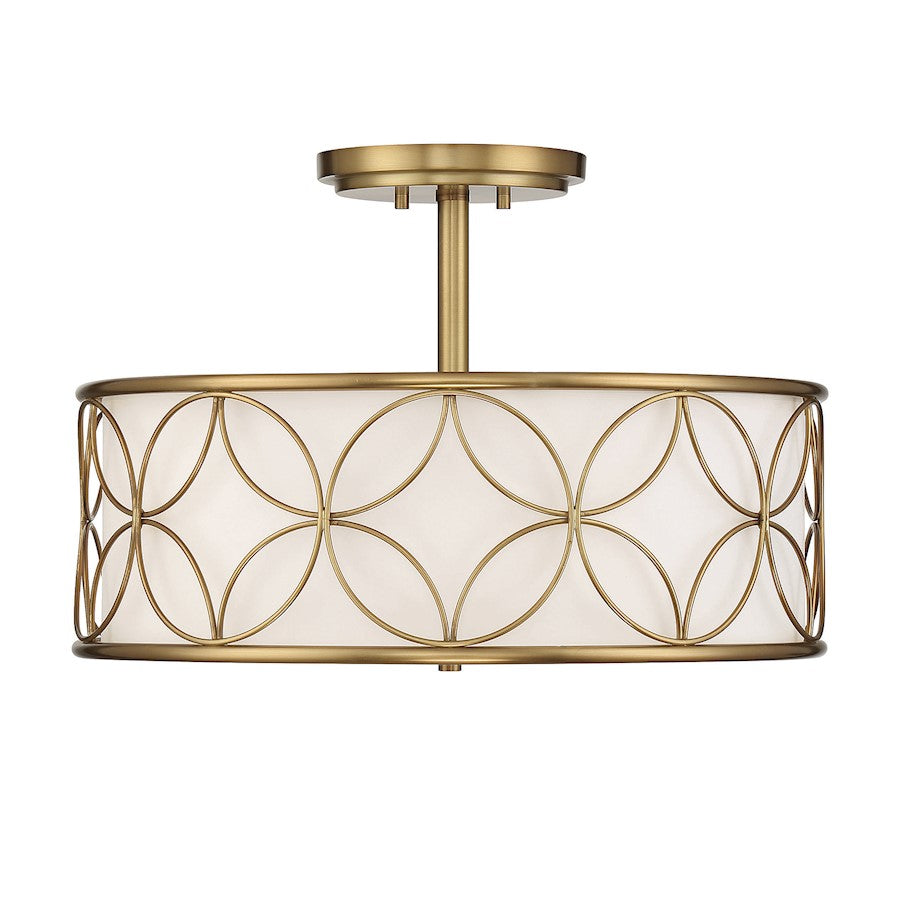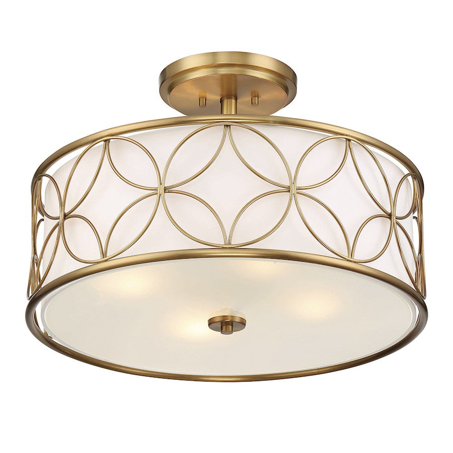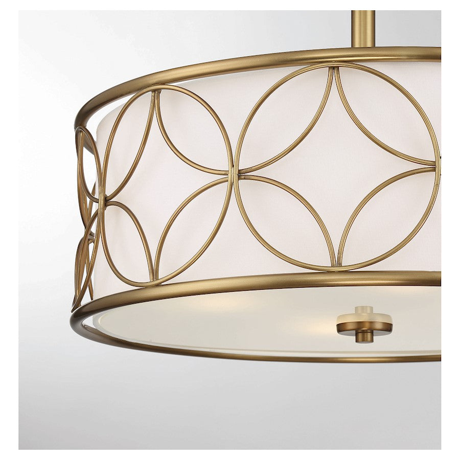 A beautiful geometric pattern adorns this Savoy House Reid 4-light ceiling light. Finished in warm brass, the pattern pops brightly against the inner white fabric shade. Reid is perfect for boosting the illumination in any room, even smaller spaces. It is 13.5" in height and 20" in diameter. It uses four standard size bulbs of up to 60 watts per bulb.