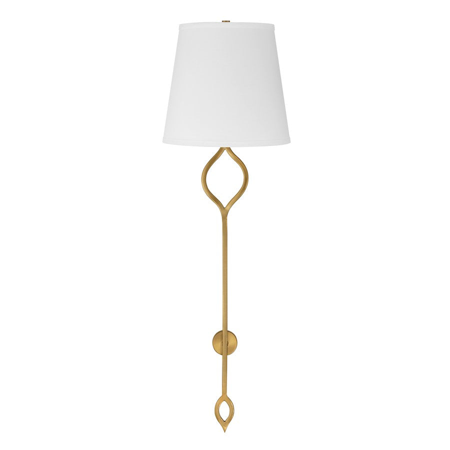 Add a stately lighting look to any space with this Savoy House Roxbury 2-light sconce. Its arm, finished in Warm Brass, showcases thoughtfully placed detailing that contrasts nicely with the white fabric shade. Roxbury is 31.5" in height, 9.5" in width and extends 6" from the wall. Uses two candelabra size bulbs of up to 60 watts per bulb. Bulbs not included. This sconce is damp area rated.