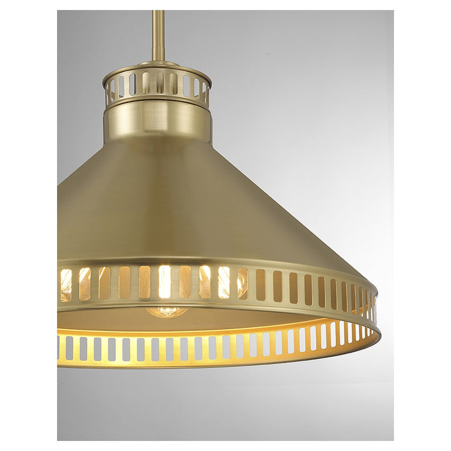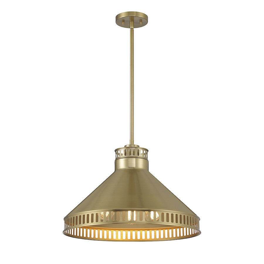 Laser-cut detailing on the metal shade of this Savoy House Seagram 3-light pendant brings a thoughtful touch of intrigue to this industrial look. Finished in warm brass. Seagram is 20" in width and has an adjustable height ranging from 14.5" to 68". Comes with four 12" downrods and one 6" downrod. It uses 3 standard size bulbs of up to 60 watts per bulb (bulbs not included).