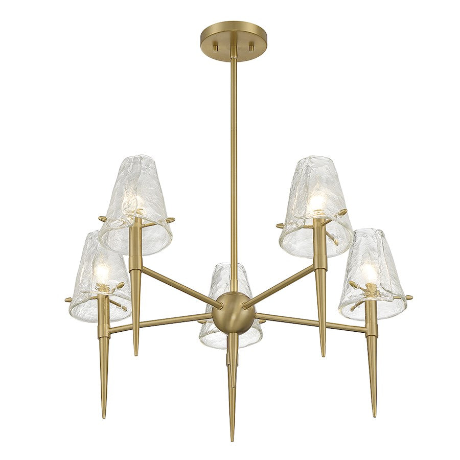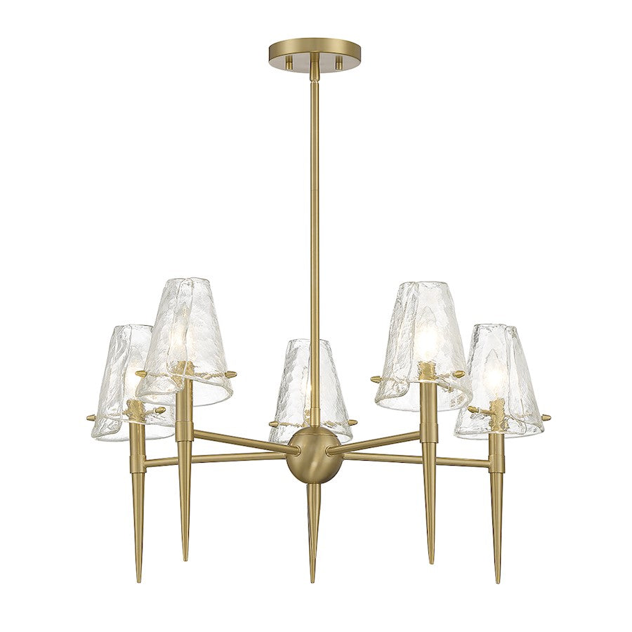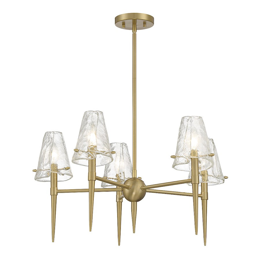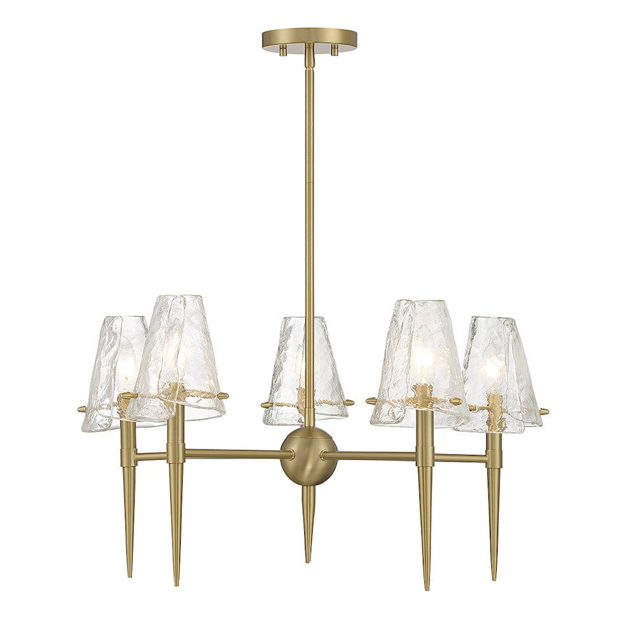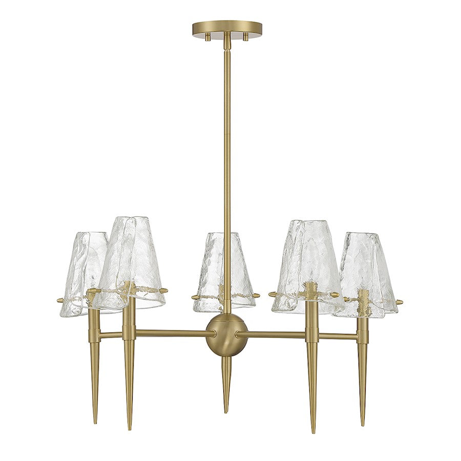 This Savoy House Shellbourne 5-light chandelier flaunts the perfectly imperfect with shades of highly textured handmade piastra glass that are wrapped around the lights. Warm brass finish. Shellbourne is 26" in width and has an adjustable height ranging from 14.5" to 68". Comes with four 12" downrods and one 6" downrod. Uses 5 candelabra size bulbs of up to 60 watts per bulb (bulbs not included).