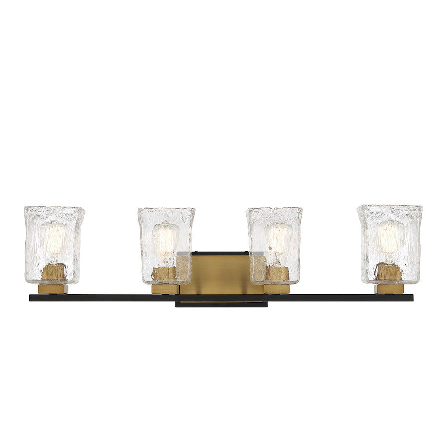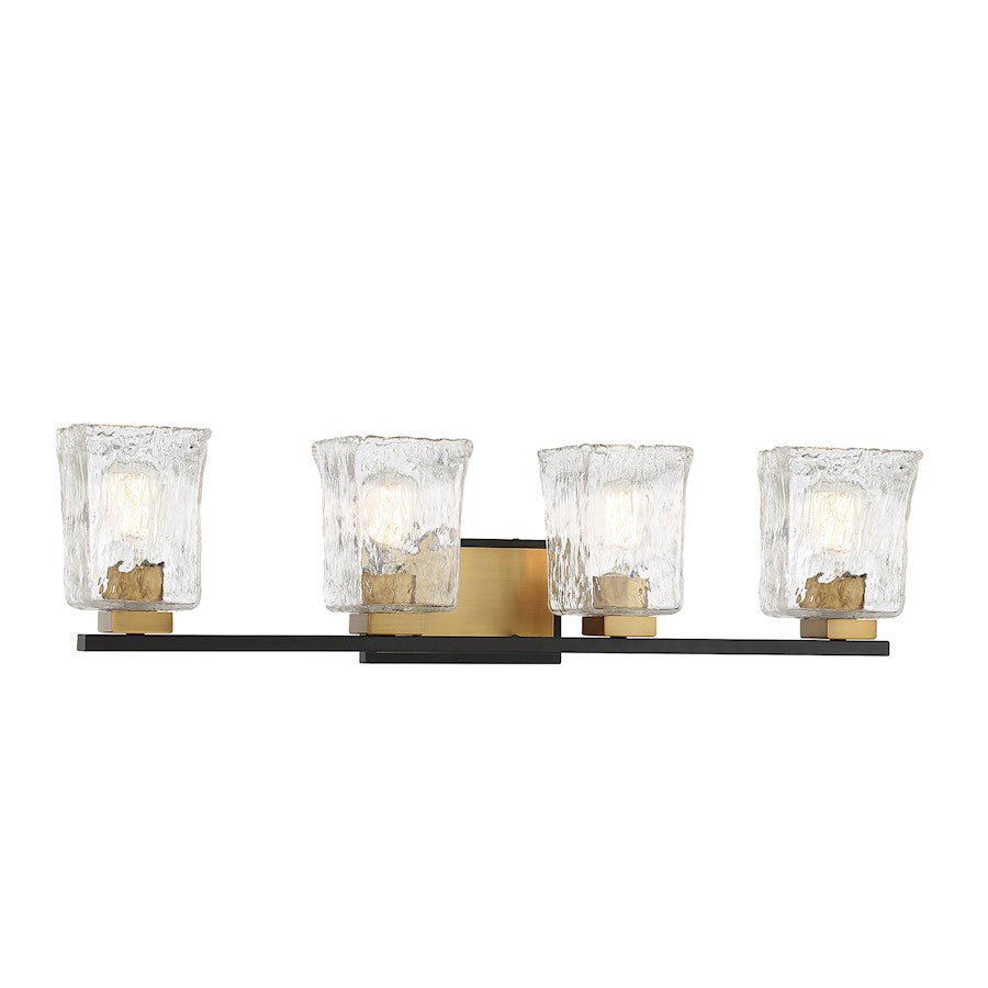 A fashionable blend of matte black and warm brass makes this Savoy House Sidney 4-light bathroom vanity light a bold choice for the bath. Highly textured clear water glass shades add an extra dimension of intrigue. Sidney is 8" in height and 32" in width. It extends 6.75" from the wall. Uses four standard size bulbs of up to 60 watts per bulb. Damp area rated.