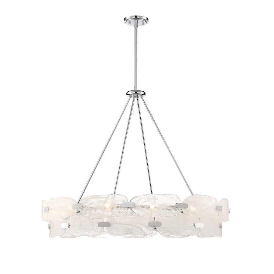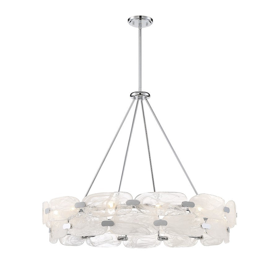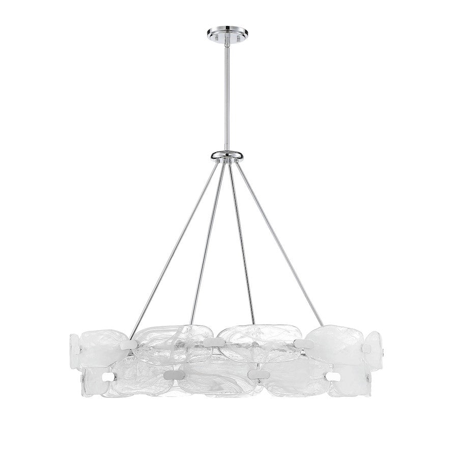 For a truly beautiful and unique lighting look, consider bringing in the Vasare 12-light pendant from Savoy House. Its sleek, contemporary circular shape flaunts a ring of hand-made marble glass, each pane showcasing totally unique swirls, united by a simple structure that is finished in chrome. It is often said that lighting is the jewelry of the home and Vasare, with its stunning glass and metal clasps, is a perfect example of this saying! Great for use in a wide variety of spaces, such as kitchens, living rooms and even entryways. This fixture is 38" in width and has an adjustable height that ranges from 37" to 83".