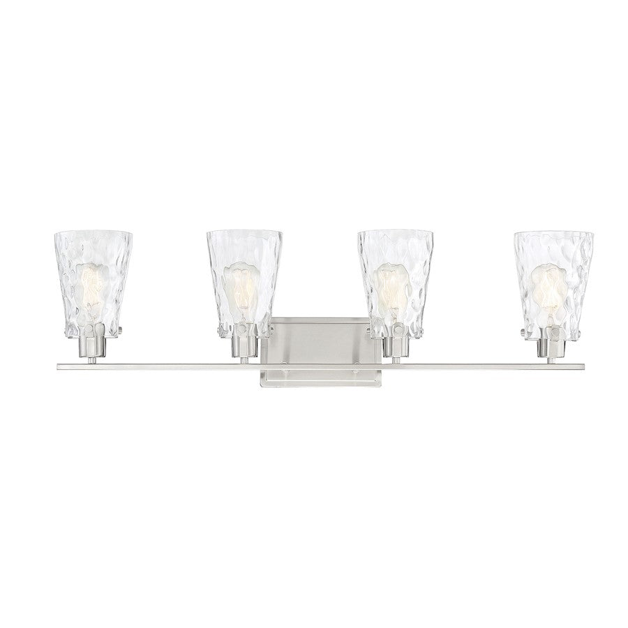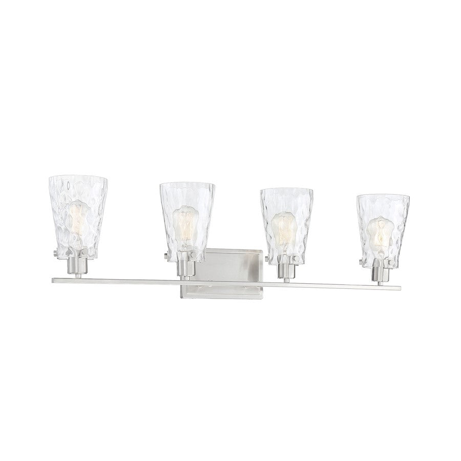 If you want a fresh, elegant lighting look in your bathroom, the Savoy House Vaughan 4-light bath bar is the perfect choice. Its sleek design showcases tall fluted shades of clear water glass that are held snugly in place with clasps and screws. The satin nickel finish works beautifully with many different colors of bathroom furnishings and hardware. This fixture is 32.5" wide and 9.25" tall. It extends 6" from the wall. Uses 4 standard size bulbs of up to 60 watts each (not included).