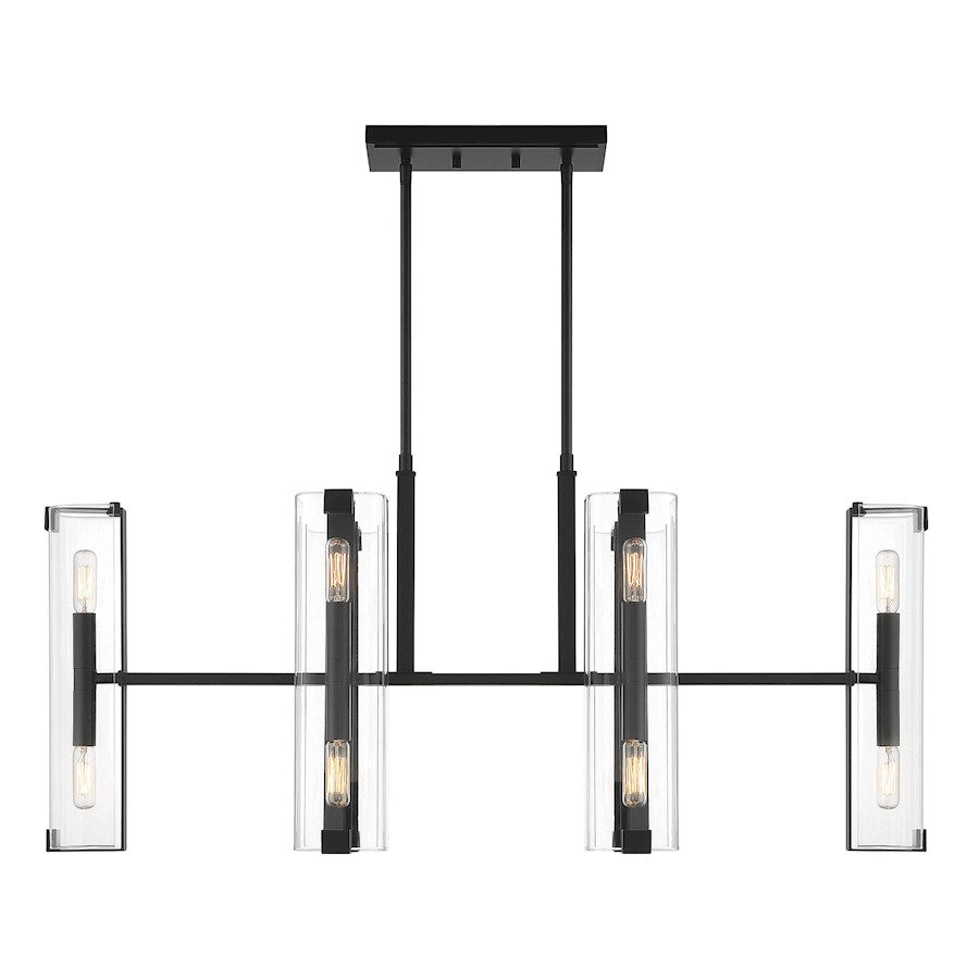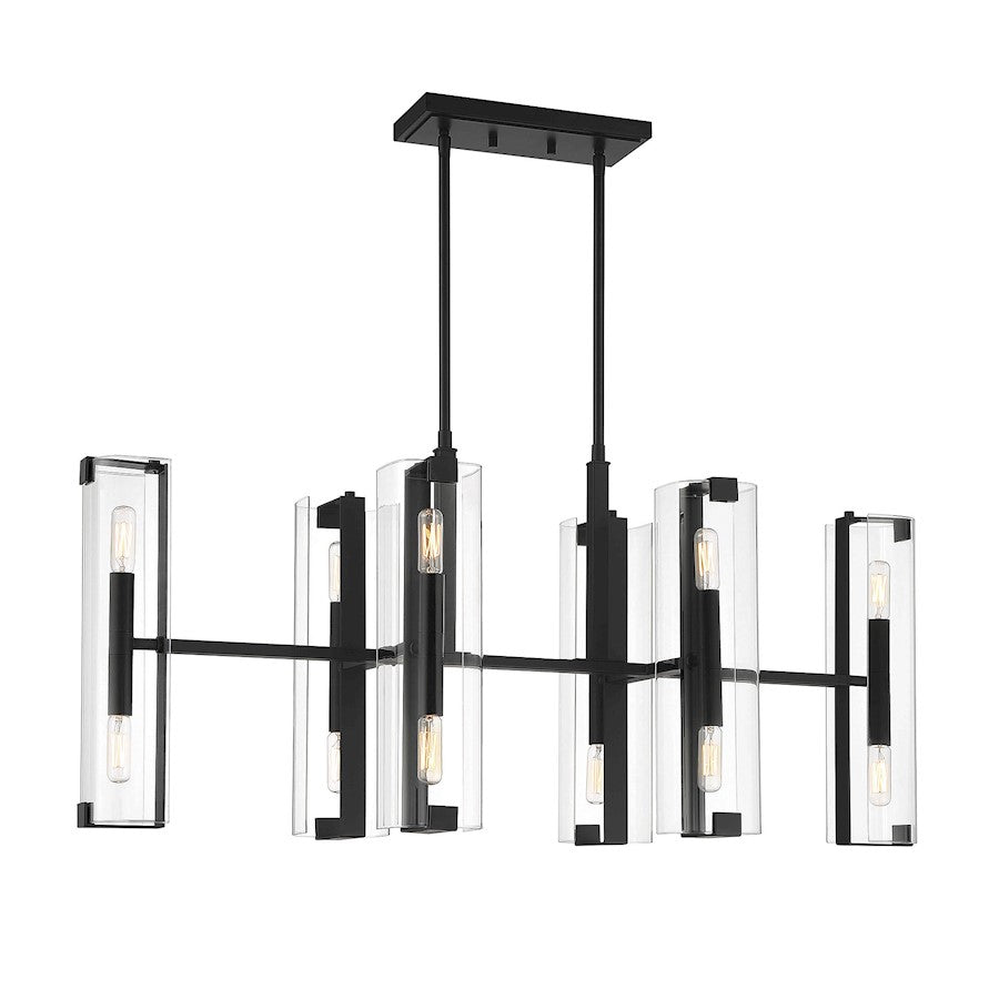 Sleek and sophisticated! The Savoy House Winfield 12-light linear chandelier has an eye-catching design, yet the clean lines and transparent glass keep the mood serene. Bold straight lines of the downrod, frame and bulb sockets are highlighted by the matte black finish. Each of the six light arms holds two 60W candelabra size bulbs, one facing up and one facing down, for splendid illumination through the pristine clear glass shades. This chandelier measures 38" long and has an adjustable height ranging from 23.25" to 69.75". Overall, it’s a chic and stylish fixture for your dining room, living room, entryway, kitchen island, family room, bar, office or media room.