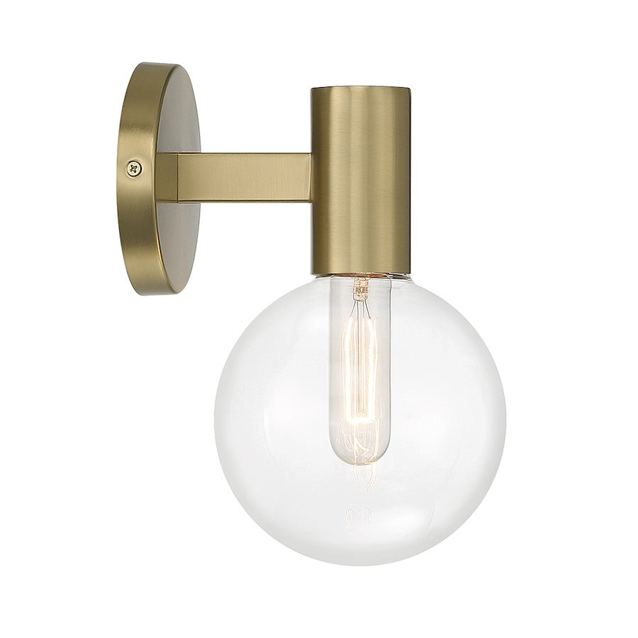 This Savoy House Wright 1-light sconce showcases streamlined style that makes it ideal for any space. A round clear glass shade adds an extra dimension and extra protection for the light bulb within. Warm brass finish. Wright is 10" in height, 5.75" in width and extends 7.5" from the wall. Uses 1 standard size bulb with a max of 60 watts (bulb not included). We recommend using a tubular shaped bulb.