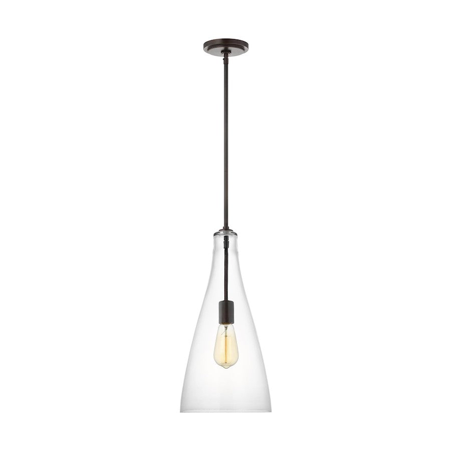 The Arilda one-light pendant collection from Sea Gull Lighting springs to life with the fine artistry and technique of hand-blown glass. Spindle-inspired Clear glass shades give dimension and character to these traditional pendant lights. Paired with Edison-style bulbs, this pendant is a period-inspired classic to complement a wide range of décor from Colonial to nautical to rich, European inspired settings. Available in two hardware finishes, Heirloom Bronze and Brushed Nickel, Arilda pendants may be installed as single pendants or clustered in multiples, which would be an ideal installation used for entry lighting, dining room lighting, living room lighting or kitchen lighting over a table.
