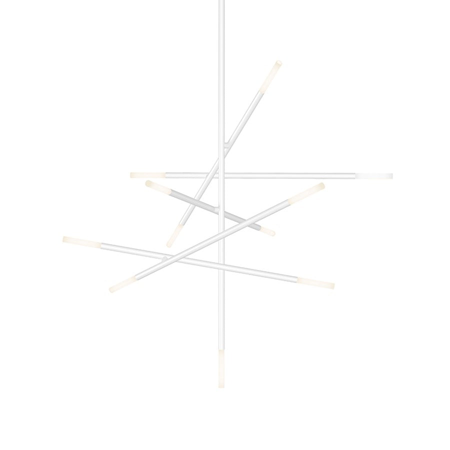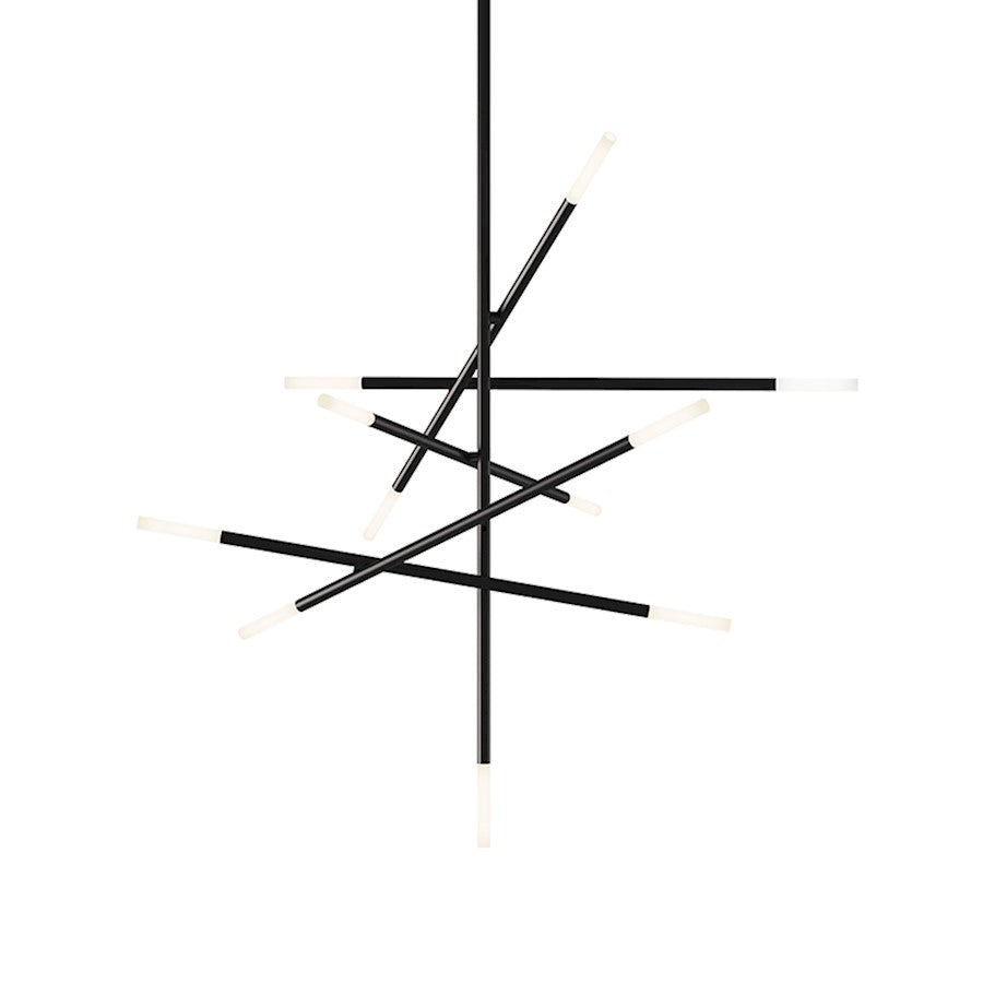 Intersecting wands of illumination form an abstract configuration about a vertical axis. Dramatically scaled, Qux derives its sculptural interest from the complexity of the arrangement of its simple elements. The Qux luminaire can be used alone or combined with others to form an expansive composition of intersecting sculpture.