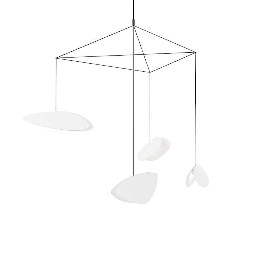 Delicately floating in suspension, these iconically modern, whimsical shapes bring the pathos of Modernism and the colors of Mondrian and Miró to the technology of today's art of light. Available in several configurations, these light sculptures offer scale to modern primitive environments that playfully allow the activity of movement within its space.