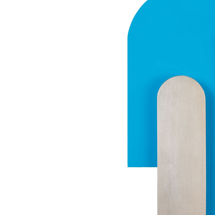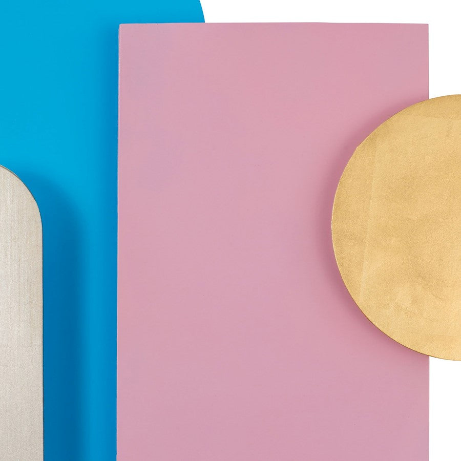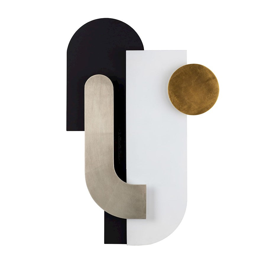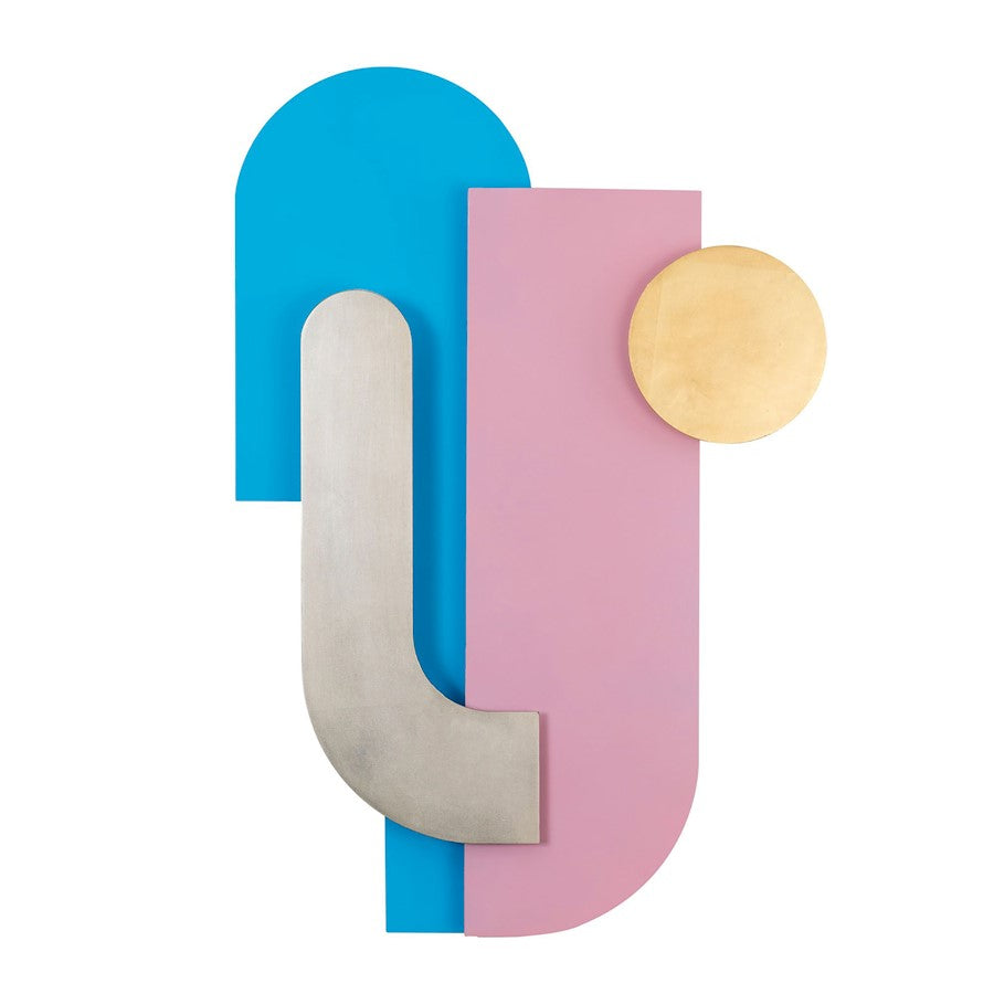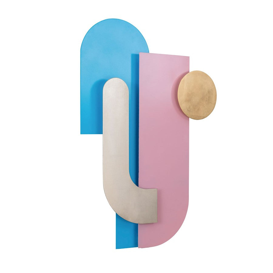Inspired by Memphis style and the 1980s’ comedy movie featuring Danny D. and the divine Miss M. Form is taken over function with geometric ornamentality and exaggerated color use. Recycled steel wall sculptures in multicolor and a more “now” blend of black, white and metallics.