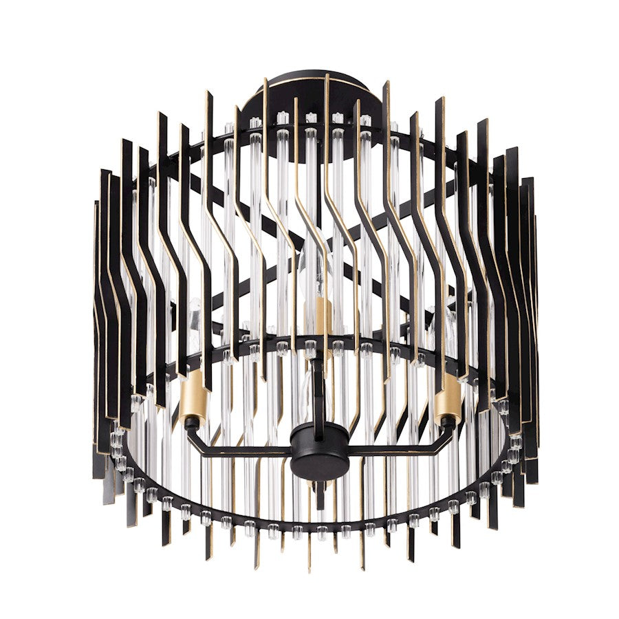 Inspired by the elements of New York City’s Brooklyn Bridge as depicted in an illustration found in Smithsonian American Art Museum, the Park Row collection is sure to bridge the gap between functionality and inspired design. The Brooklyn Bridge’s neo-Gothic stone towers support a hybrid cable-stayed/suspension bridge design, with both vertical and diagonal suspender cables, which are the inspiration for Park Row. The interwoven cables create a repeating pattern that we have wrapped around and support modern clear fluted, recycled glass rods. The collection is hand-forged from 70% recycled steel. Hand-finished in matte black with French Gold edges.