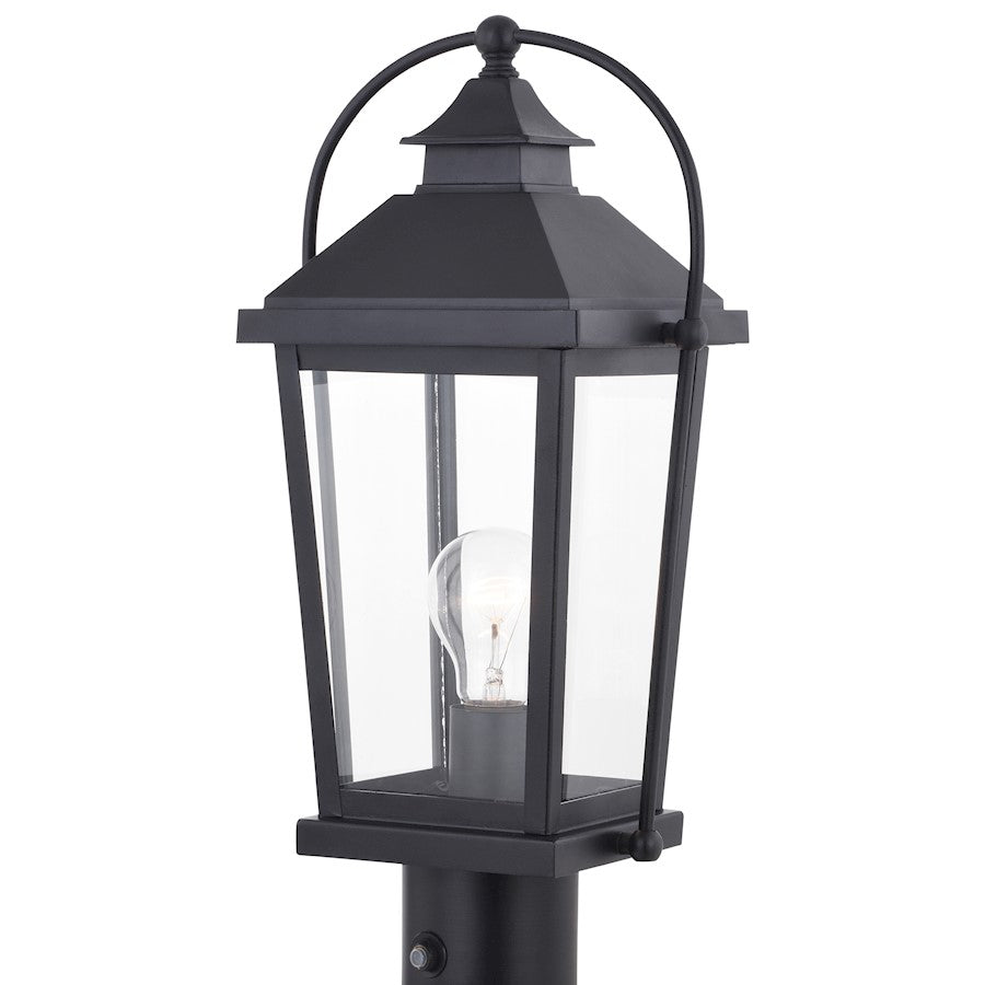 The colonial inspired Lexington collection is steeped in traditional charm. A textured black finish coupled with tapered, clear seeded glass panels are further enhanced with a curved metal lantern handle creating a carriage house lantern look. Combine that with vintage Edison style filament bulbs to complete the look. This post light mounts on a 3-inch diameter post (not included). Ideal for illuminating your yard, driveway, or any other area of your home.