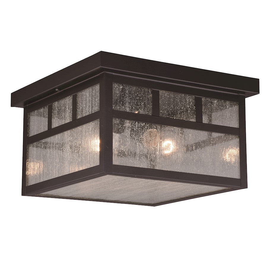 This simple, casual collection named Mission lives up to its name. Flat strips of burnished bronze outline clear seeded glass panes. These lantern inspired shapes are a beautiful compliment to any craftsman or prairie style inspired outdoor space. The Mission collection is offered in wall, ceiling and post mounting styles.