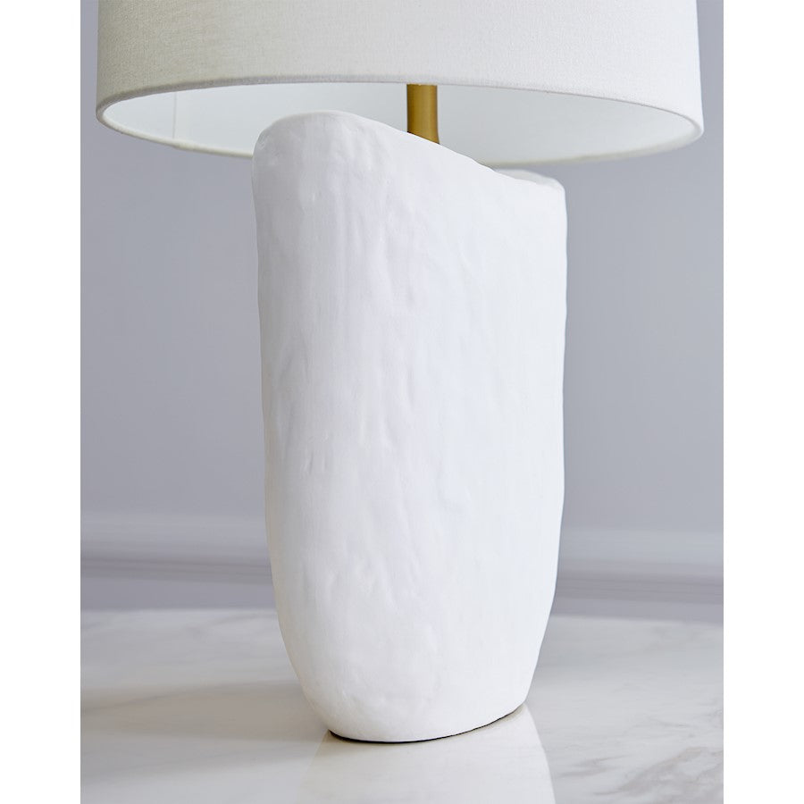 The Cenotes one light table lamp in matte white by Hable is hand built that displays organic indentations. Cenotes embodies shapely, textural abstract forms and complementing shades of fine fabric. Sweeping shoulder and curved body gives a nice canvas to see the all of unique one of a kind indentations. CENOTES provides abundant light to your home, while adding unique style and interest.