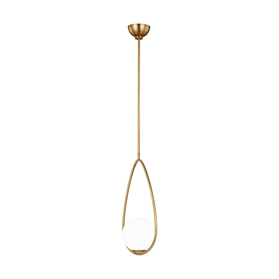 The Galassia one light single tier chandelier by AERIN in burnished brass balances glass globes on an elongated frame, which gives it a contemporary look. The white glass casts a soft, welcoming glow, while the elongated frame works particularly well in large, high-ceiling rooms. Maximum Height: 66.38"