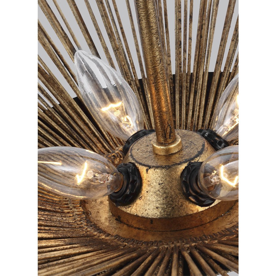 Named after the Greek God of the Sun, the Alexa Hampton Helios four light indoor pendant in Antique Gild is made with hand applied gold leaf and then hand distressed. This Mid-Century Modern fixture takes the shape of its name, with up-flowing stems resting elegantly on a round metal canopy with each metal rod hand cut and hand welded straw-like brass layers forming the shade of this textural fixture. The Helios flush mount features a dynamically cut, sun-like form and gilded iron finish. This stunning piece is an eruption of light and brings a stylish presence to any aspect of your space. The assortment includes a four-light wide pendant, six-light small pendant, eight-light tall pendant, three-light semi-flush and one-light pocket sconce. Alexa Hampton is an industry force who honors tradition and commits to the future, providing smart, stylish, design-rich solutions for every aspect of the home. Maximum Height: 82.25"