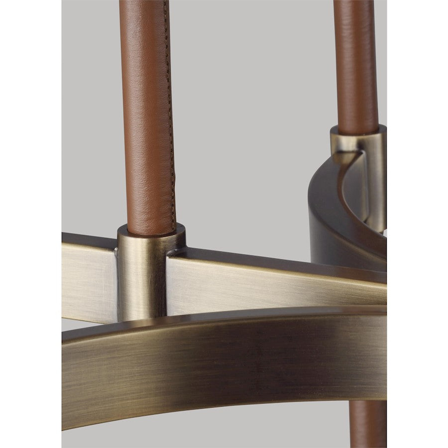 The Katie eight light billiard island chandelier in time worn brass features leather straps suspended from the chain to round out the design of this timeless series.Maximum Height: 70.75"