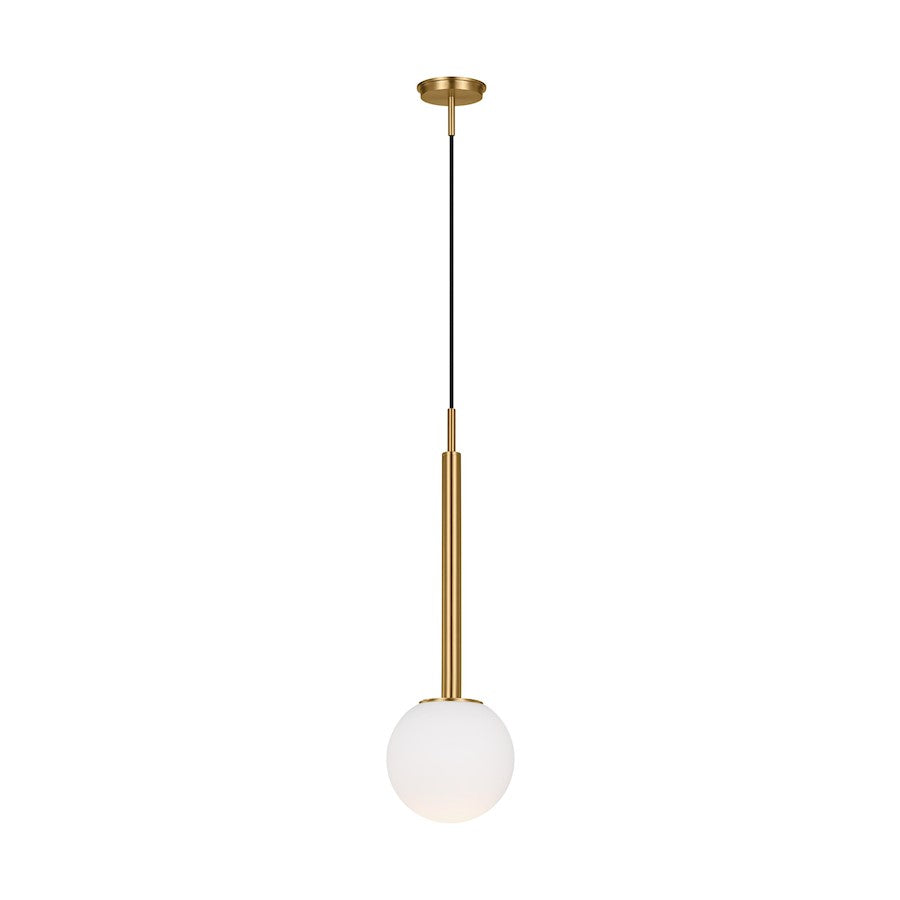 The Nodes one light indoor pendant in burnished brass provides abundant light to your home, while adding style and interest. Nodes task, ceiling and wall lighting is minimal yet bold, highlighting Kelly's distinctive juxtaposition of mixed-materiality and curvilinear form. Light radiates from milk glass globes set against metal discs. All fixtures can be used or without the discs. The cast canopy is available in Burnished Brass or Midnight Black. Hanging fixtures within this family feature black fabric cords, while pivot sconces can be cord and plug or hard wire.Maximum Height: 174"