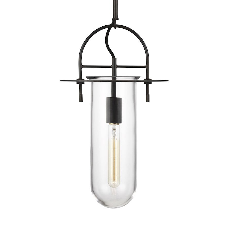 The Nuance one light indoor pendant in aged iron is the perfect way to achieve your desired fashion or functional needs in your home. The Nuance product family from Kelly for Visual Comfort Studio features clean architectural metal detailing and the dynamic beauty of cast glass. The 1/4" thick clear glass stems from a suspended frame with an exposed fabric cord. The canopy comes in Polished Nickel or Aged Iron, the living finish. Whether for ceiling, floor or task lighting, Nuance brings a great, contemporary look to any space. With its unique silhouette, the floor lamp has the appeal of the classic hour glass.Maximum Height: 76.75"