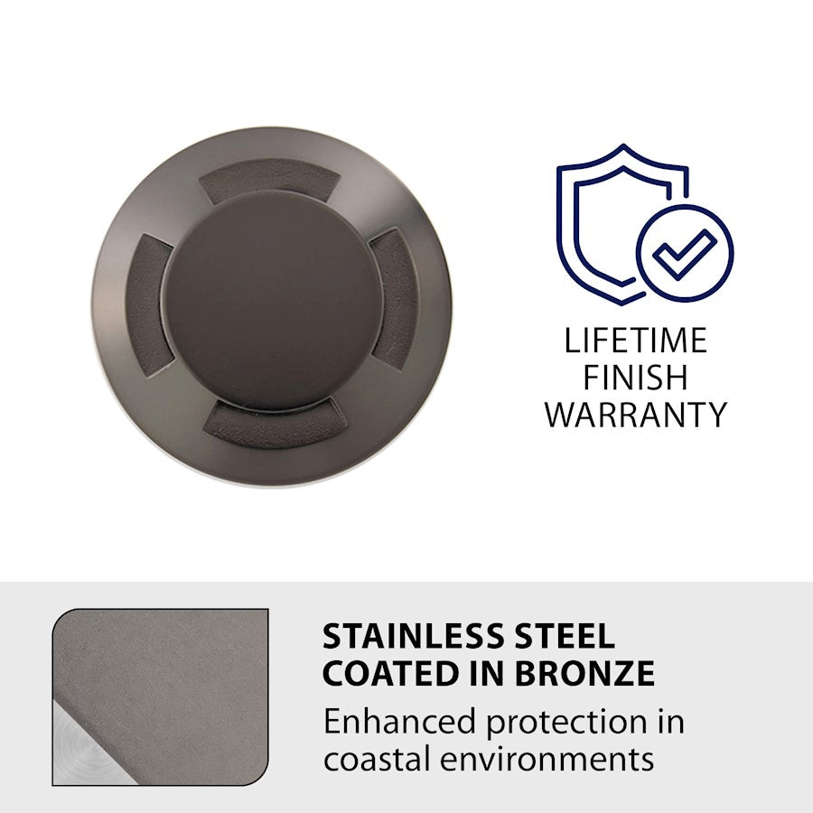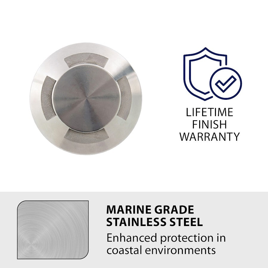LED Landscape inground indicator lights are ideal for soft or concrete ground applications and available in 1 or 2 inch sizes with a variety of interchangeable screw-on face plates. This indicator light is perfect for indoor and outdoor applications in wells and ponds, pools, deck and patios, and ceiling or walls. Factory sealed and water tight with an IP68 rating for protection against submersion up to 5 meters under water and outdoor elements. Casted with 316 marine grade stainless steel in a polished stainless steel or bronze coated finish. Stainless Steel provides enhanced protection against corrosive elements and is recommended for use in coastal and marine grade environments. Each indicator light includes 3ft of low voltage burial cable, direct burial gel filled wire nuts, and an optional spring retention clip. Magnetic or Electronic Power supply is required. Concrete pour kits are available for concrete installation options.
