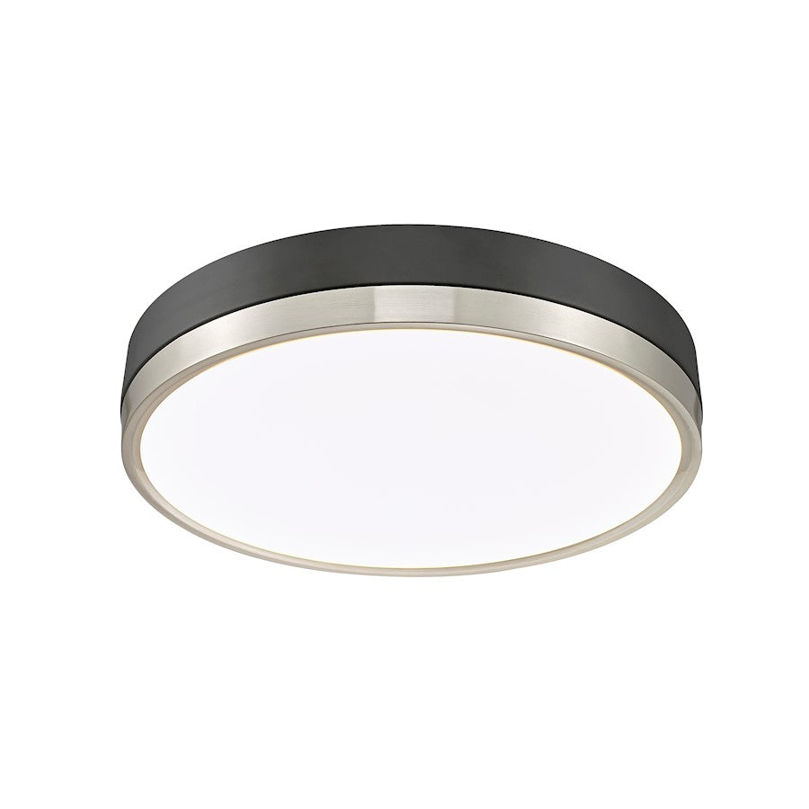 A slender ring-shaped steel canopy blends dual finishes of matte black and brushed nickel, creating a compelling look in this one-light flush mount ceiling light. Modern and classic, this fixture offers a diffuser with built-in options for dimming and white-color selections as it infuses ambient illumination downward.