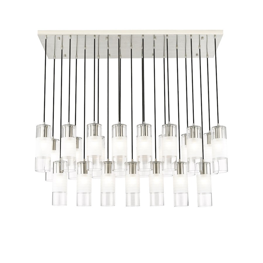 An impressive collection of 23 lights ensures grand scale for a modern linear chandelier from the Alton collection. Brushed nickel finish housings host clear and frosted glass, creating soft, inviting illumination and a sense of substance. Black braided cloth cord covers add a tailored touch, suspending lights in three rows and two tiers to deliver bold, sculptural style over an island, foyer, or dining table.